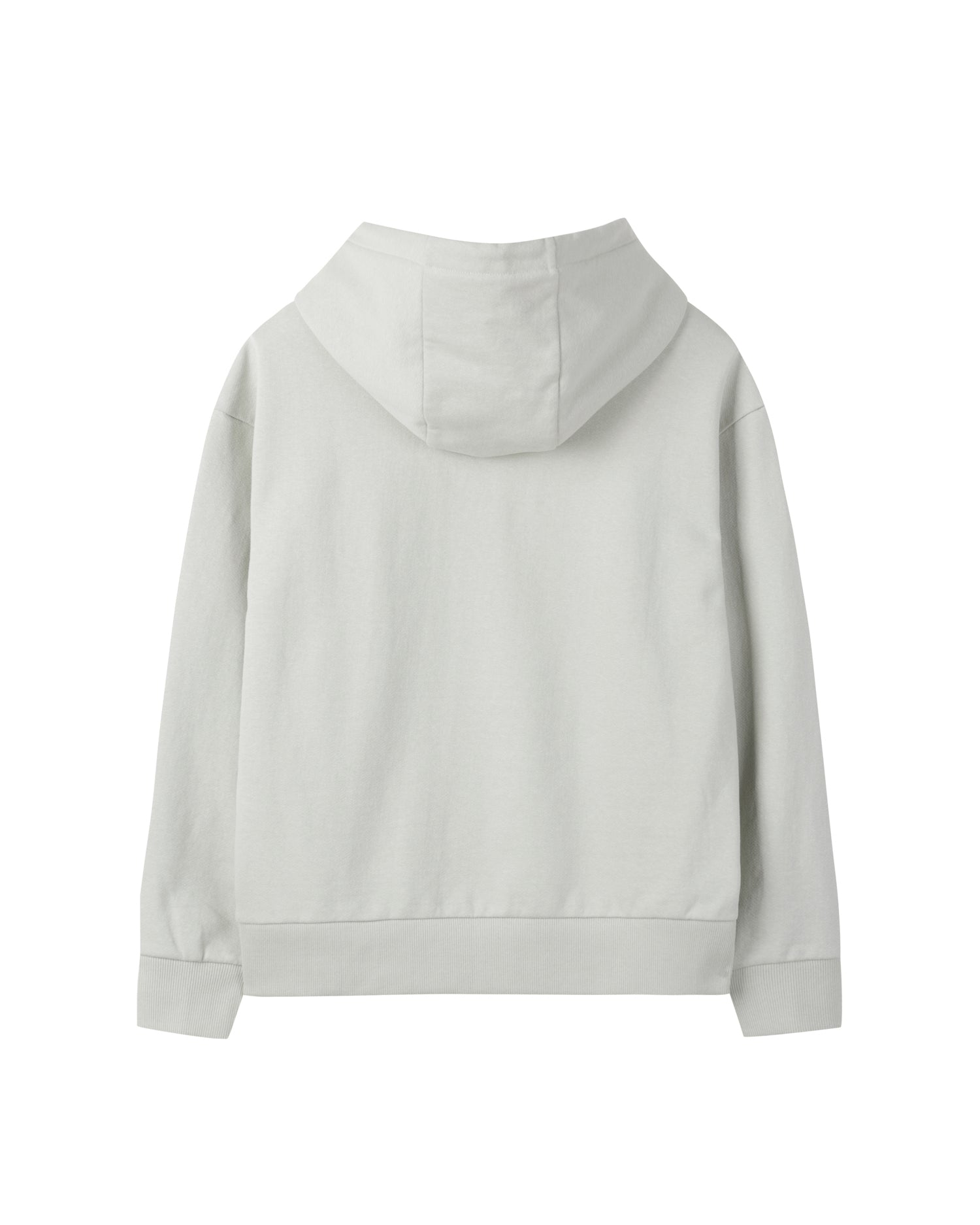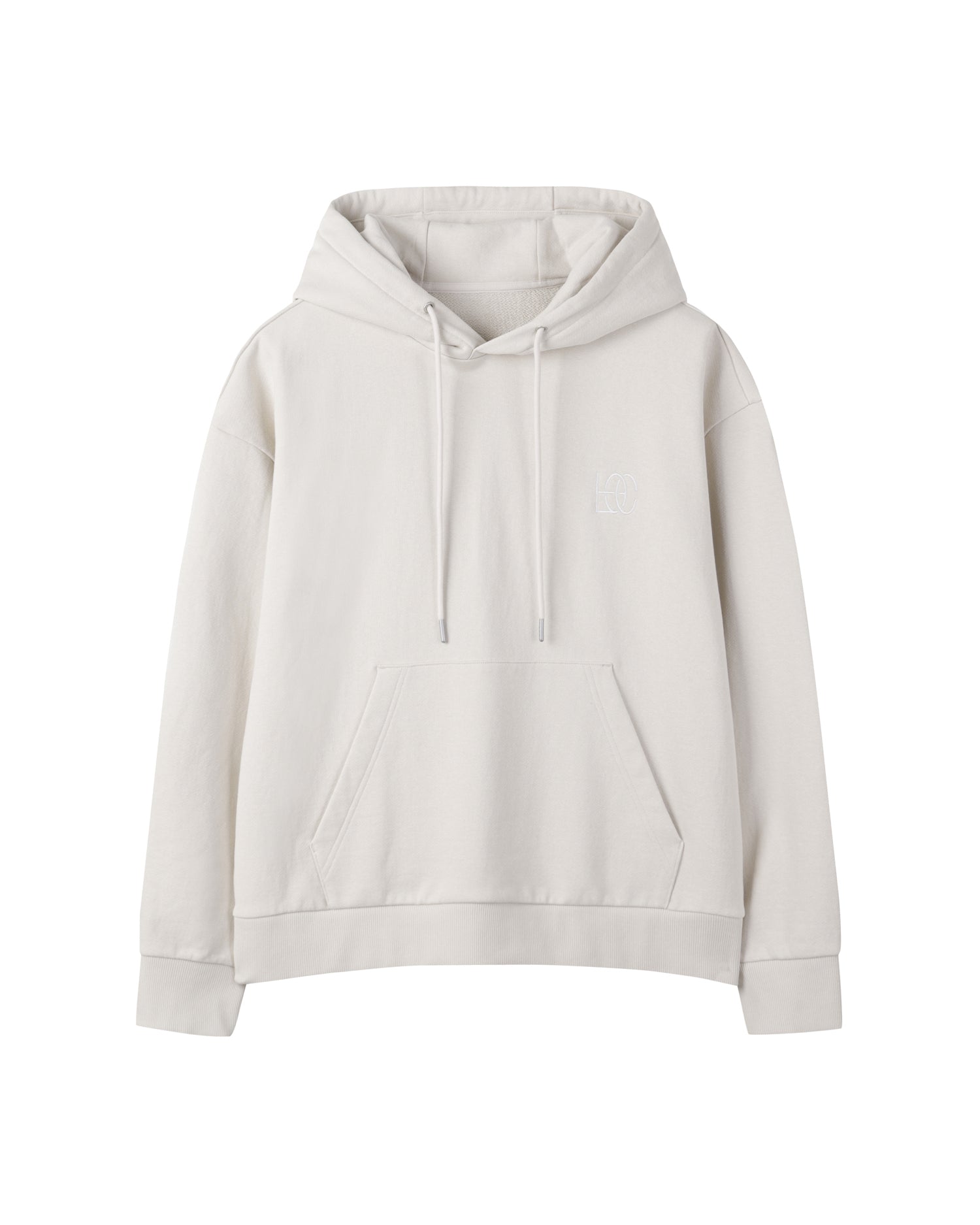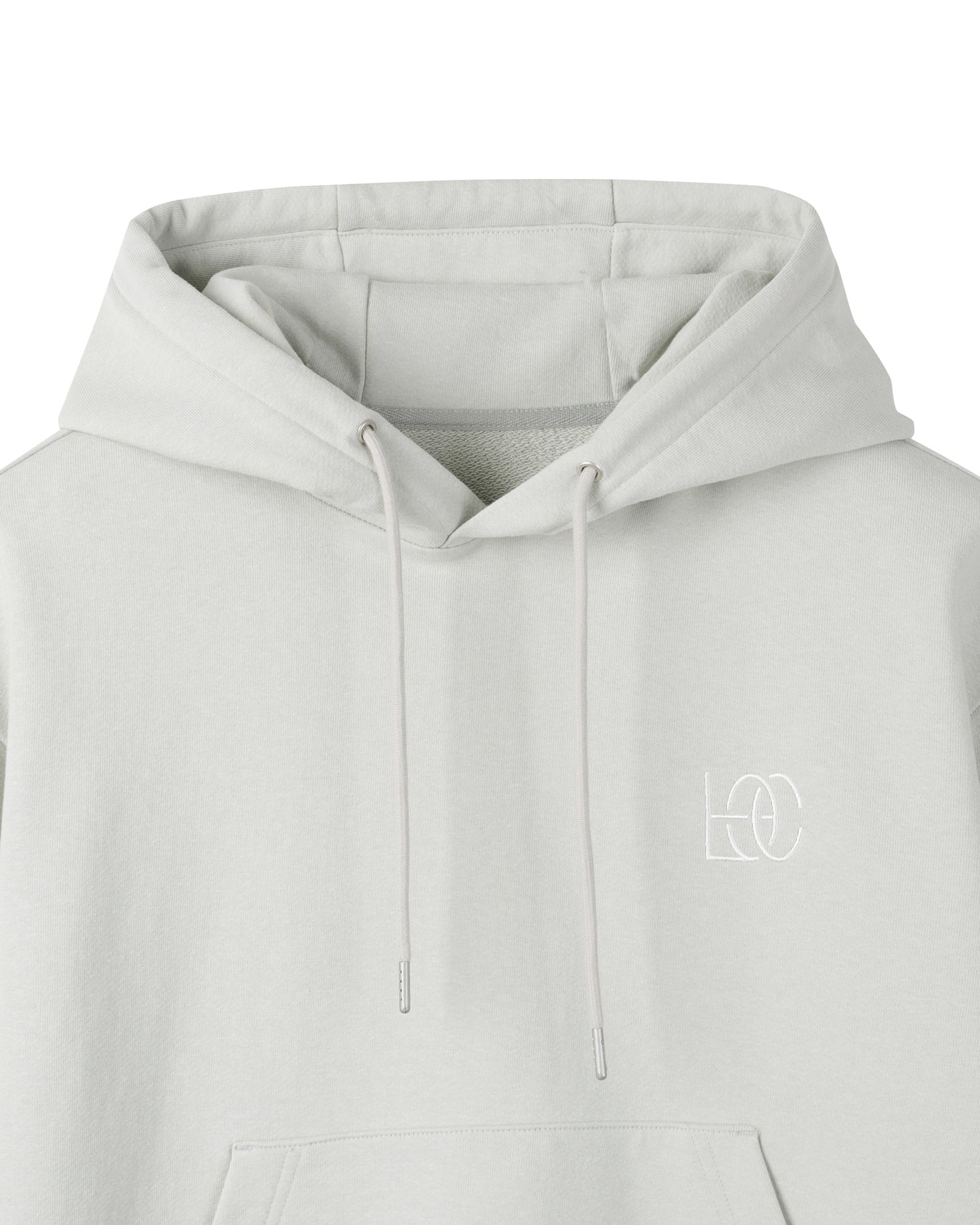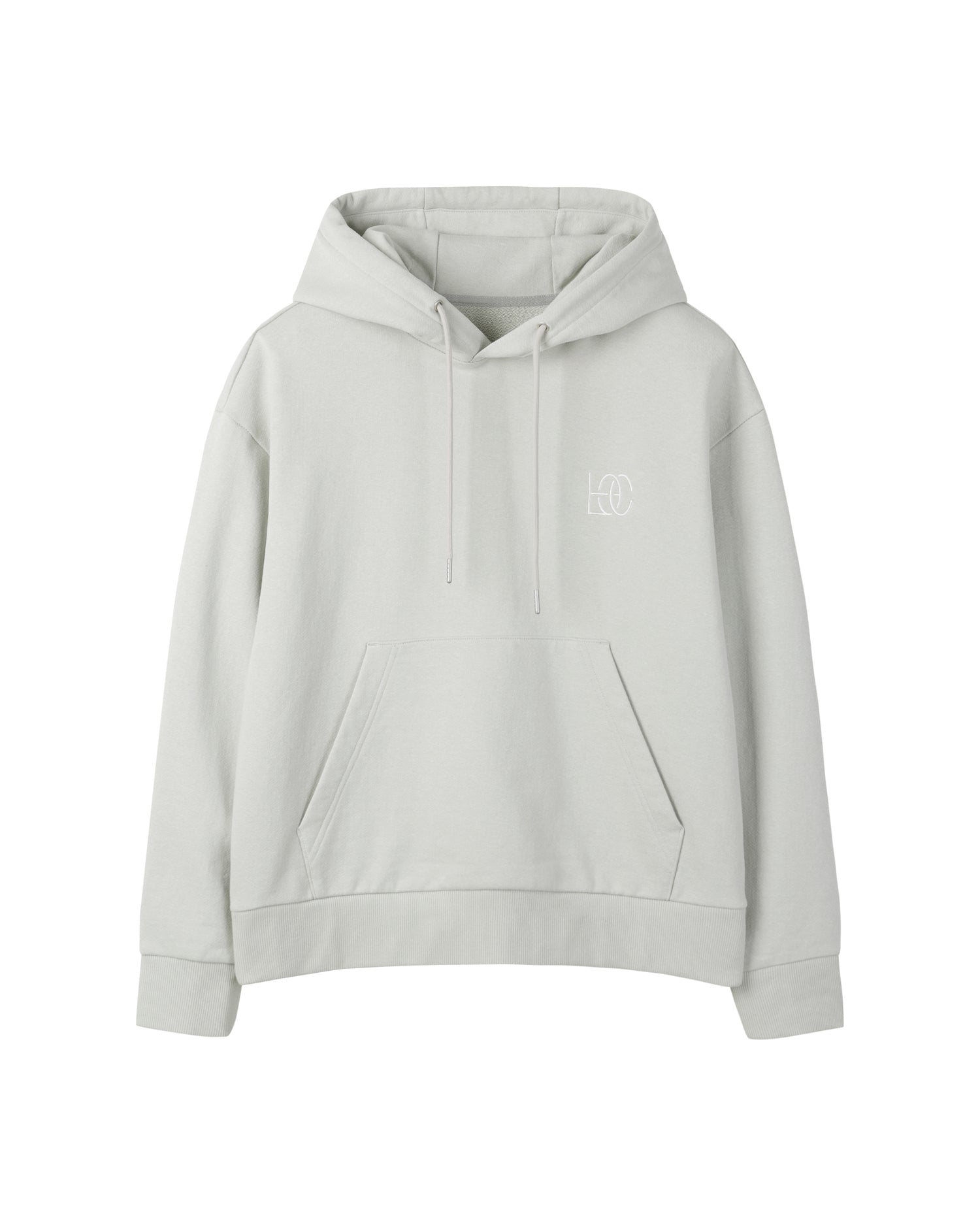 Essential Hoodie made from GRS-certified recycled cotton yarns. It features minimal branding embroidered on the front, an adjustable hood with a drawstring, and a rib-knit hem. Lightweight for all seasons.