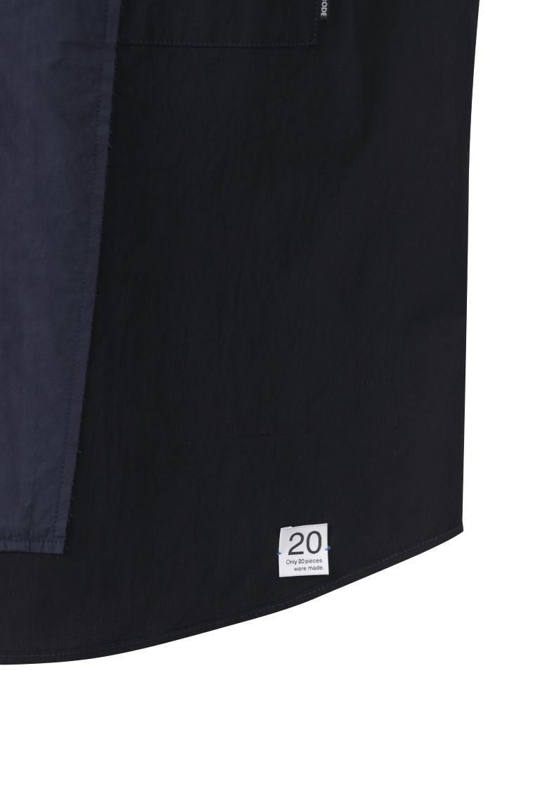 To minimize waste, the asymmetrical patchwork design was applied, and a reversed label detail was added to the back. Logo-engraved nut buttons and a single chest pocket add practical touches to the overall look.