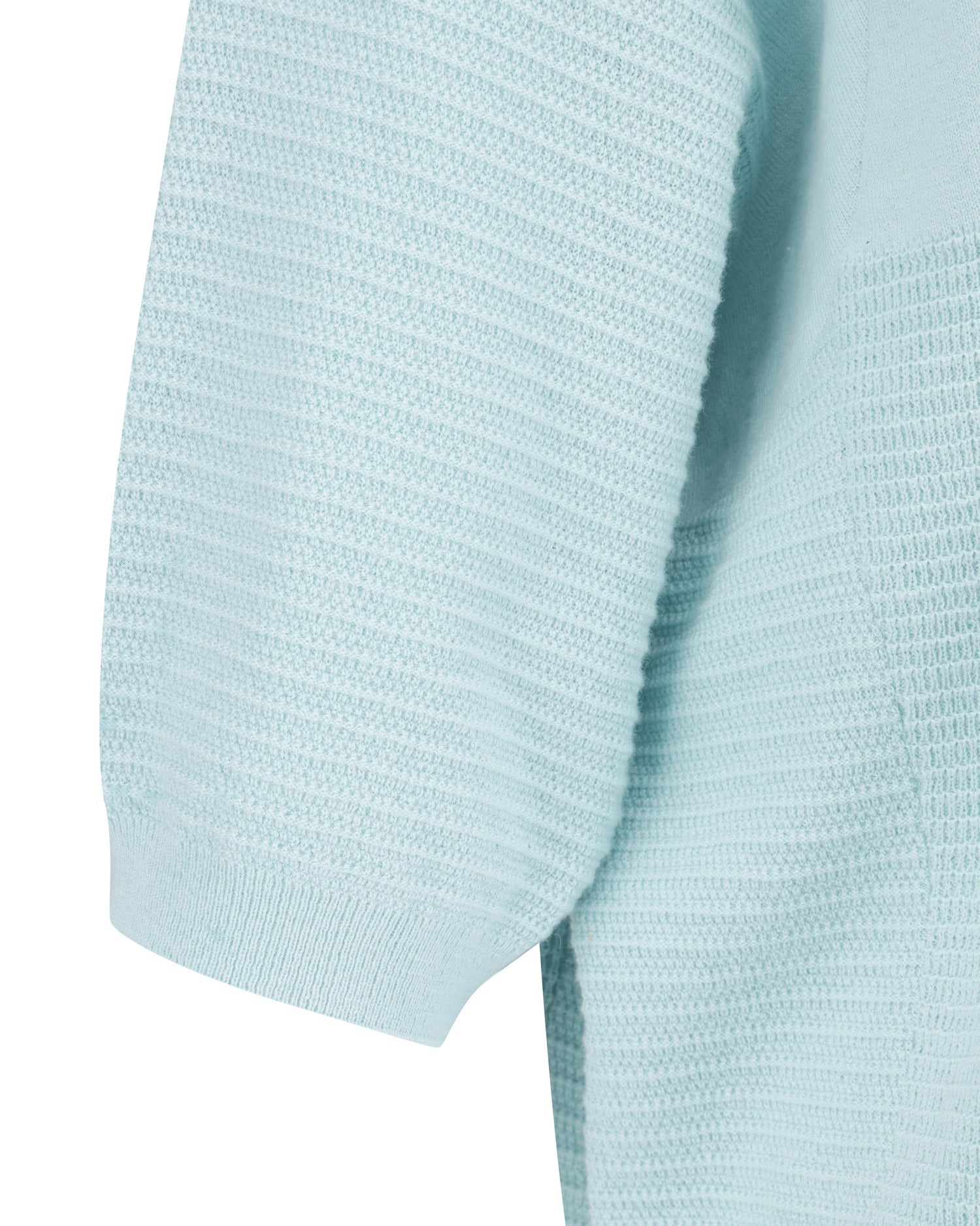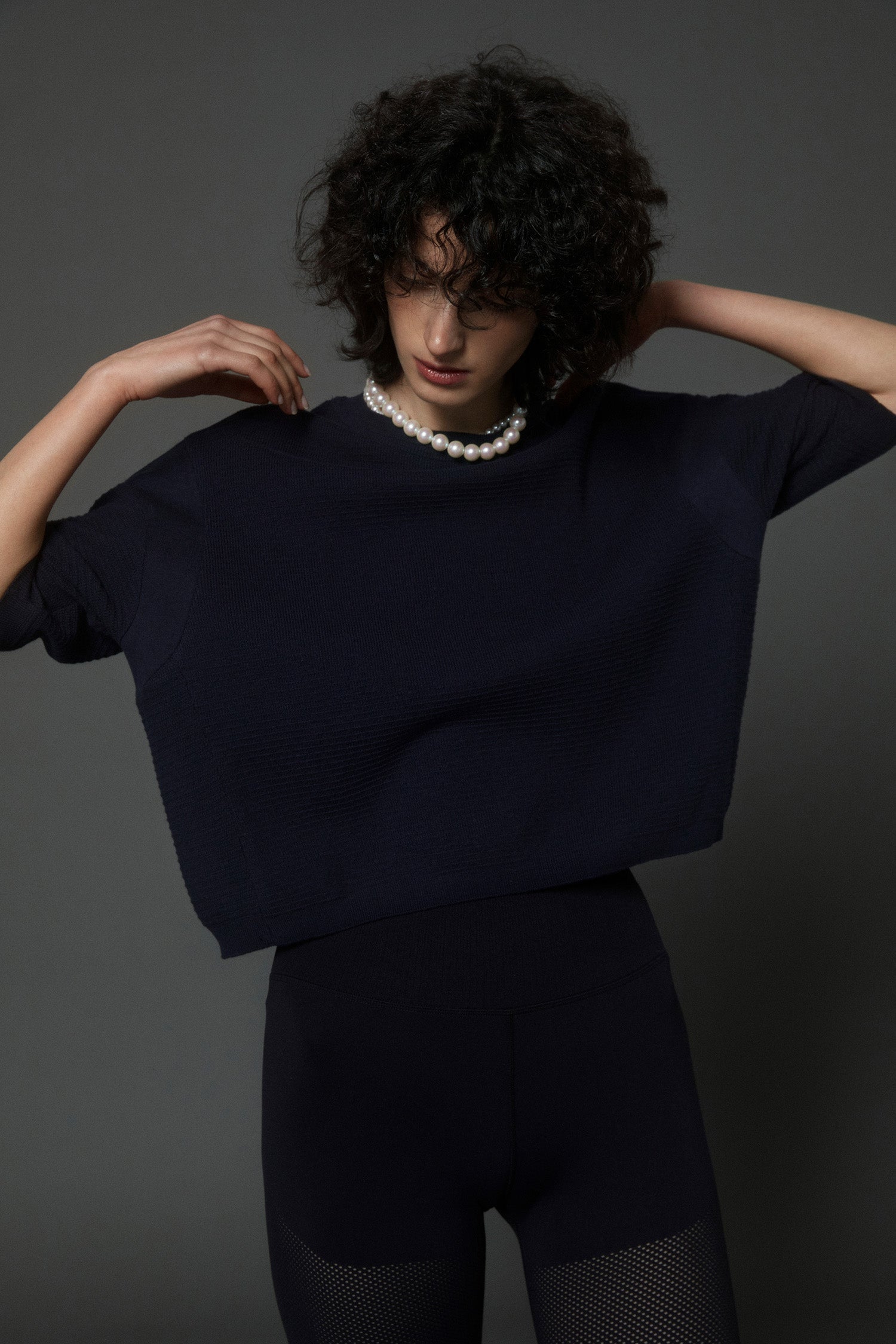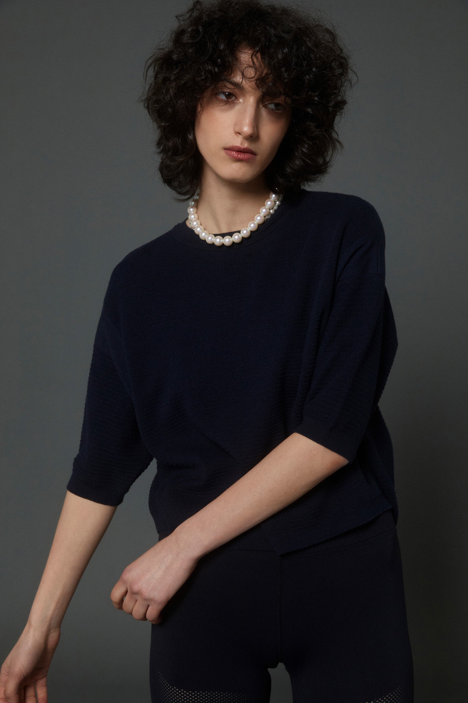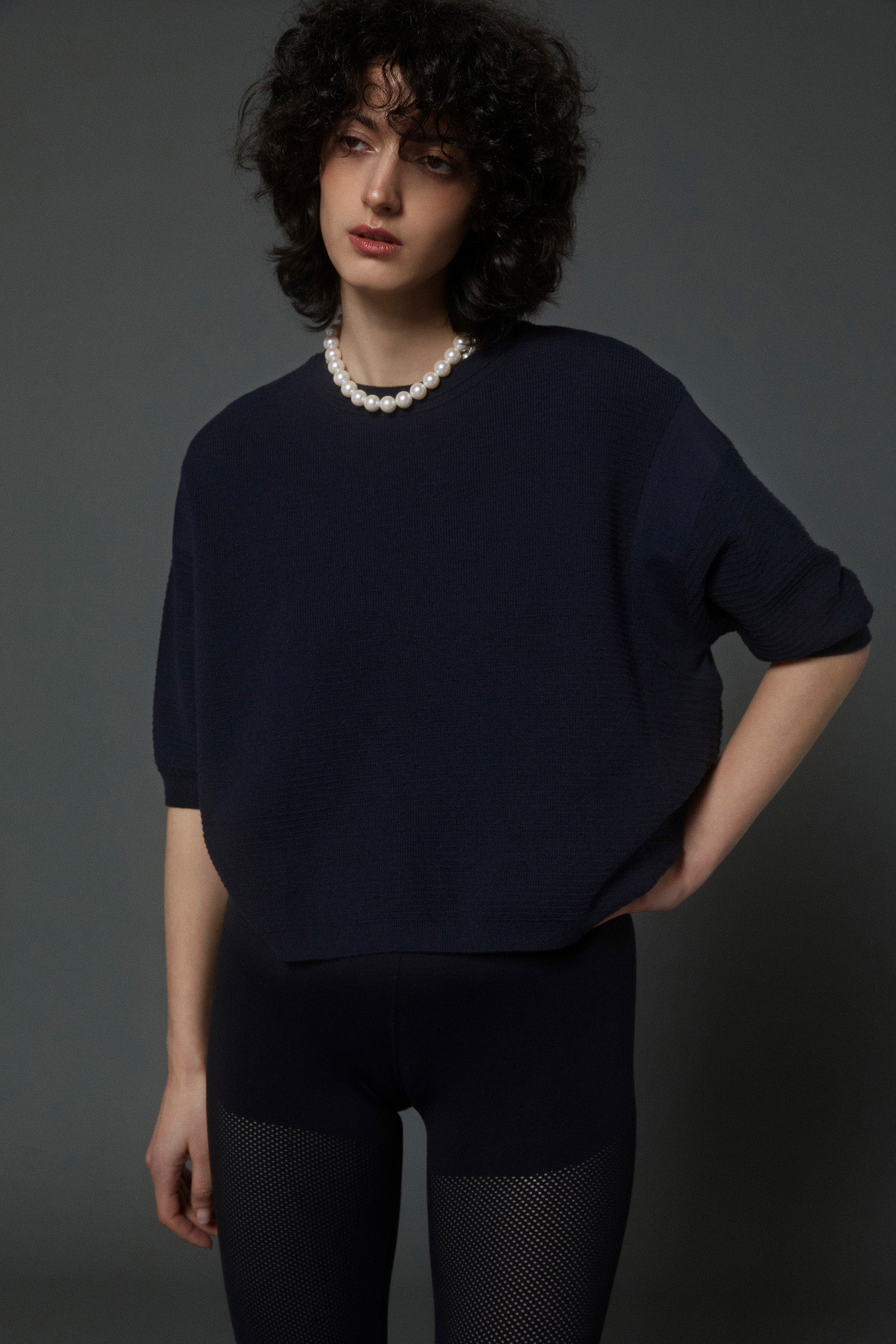 This crewneck top is knitted in a lightweight yet textured finish. It features a semi-cropped length, elbow-length sleeves and a boxy silhouette for a relaxed look. It is made from a blend of organic cotton and cashmere, giving it a soft and airy feel.