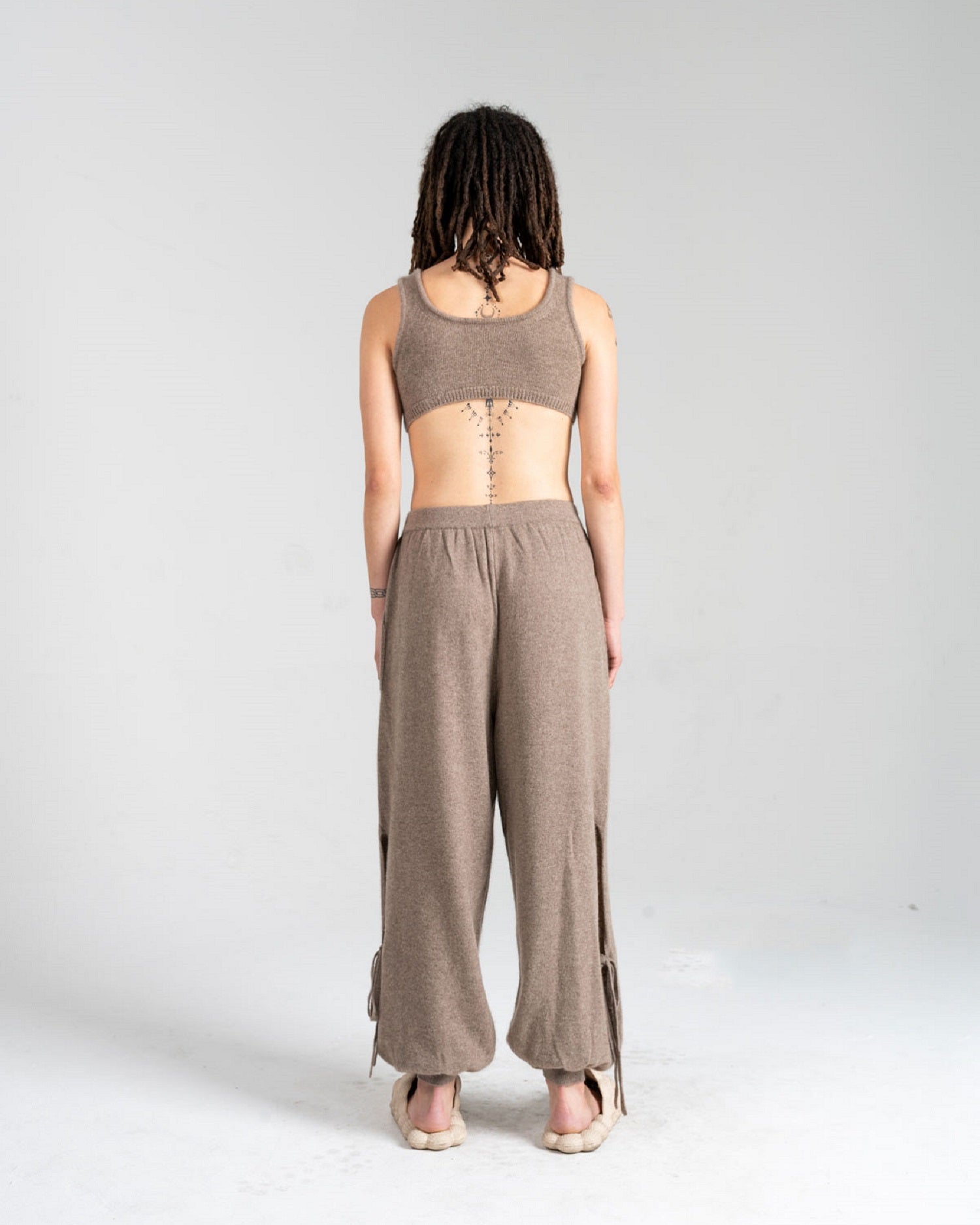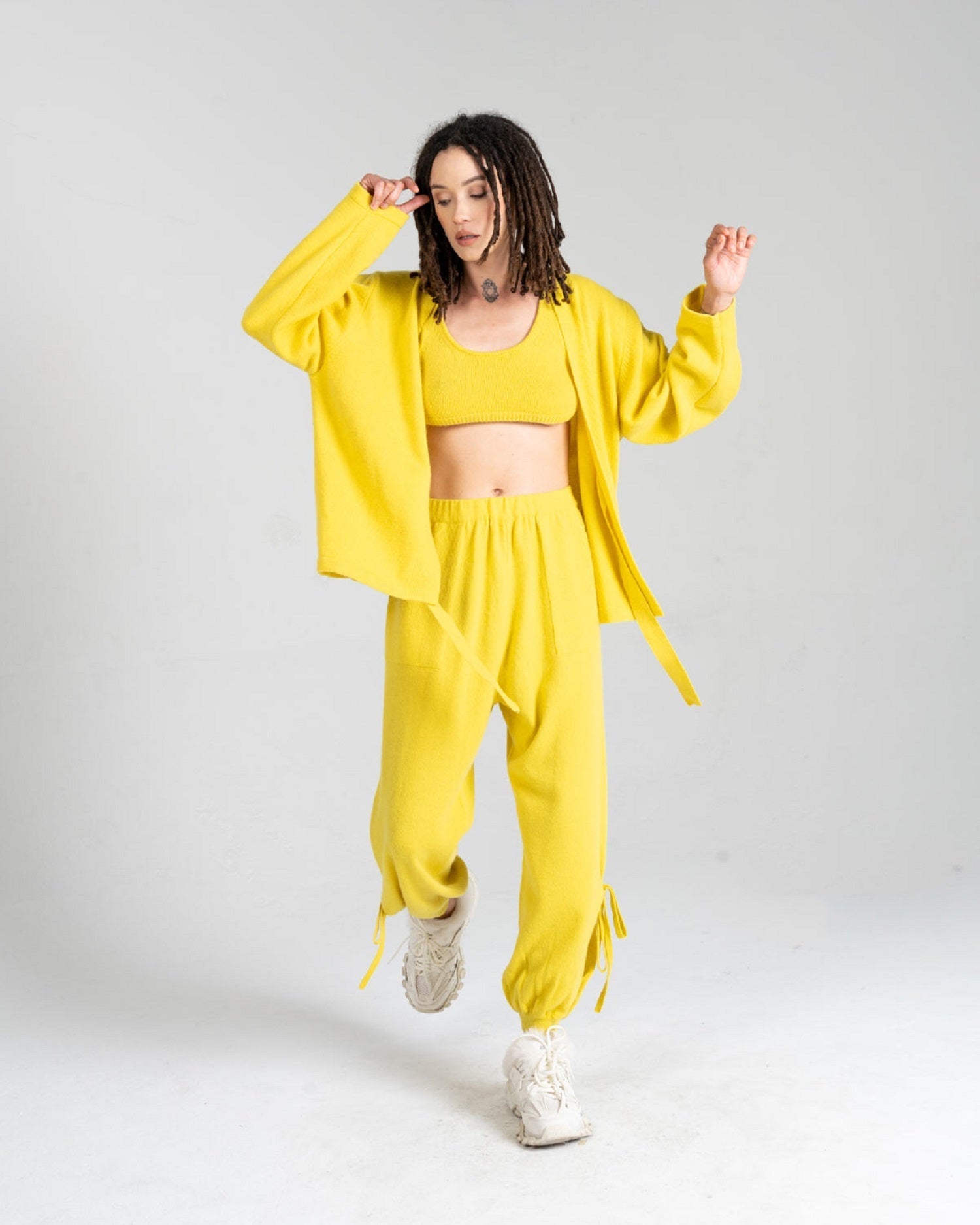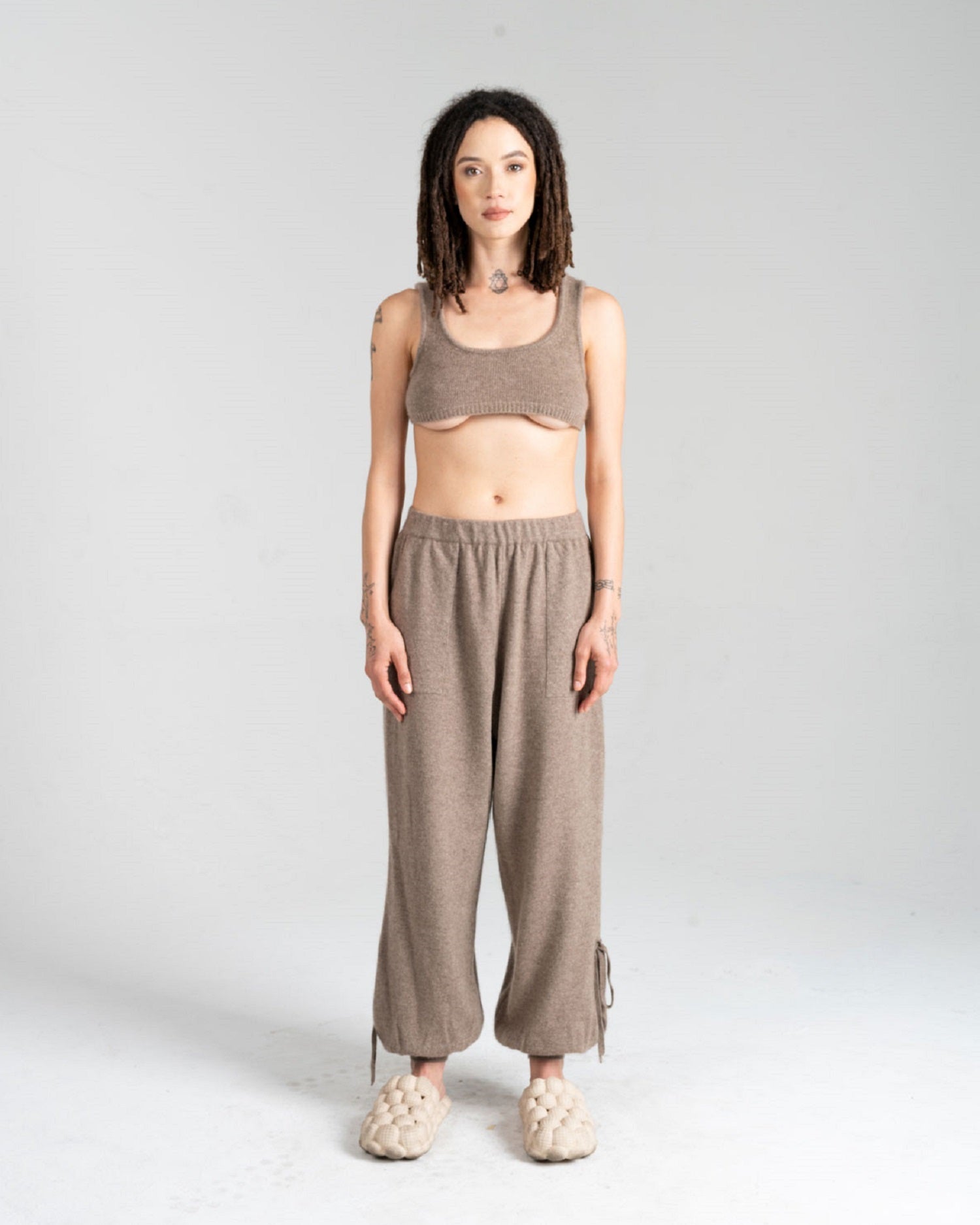 100% cashmere bralette for all-day comfort. It can also be worn as a knitted top, layered over sheer tops or t-shirts. Make it a match with Tie Cardigan & Tie Jogger.
