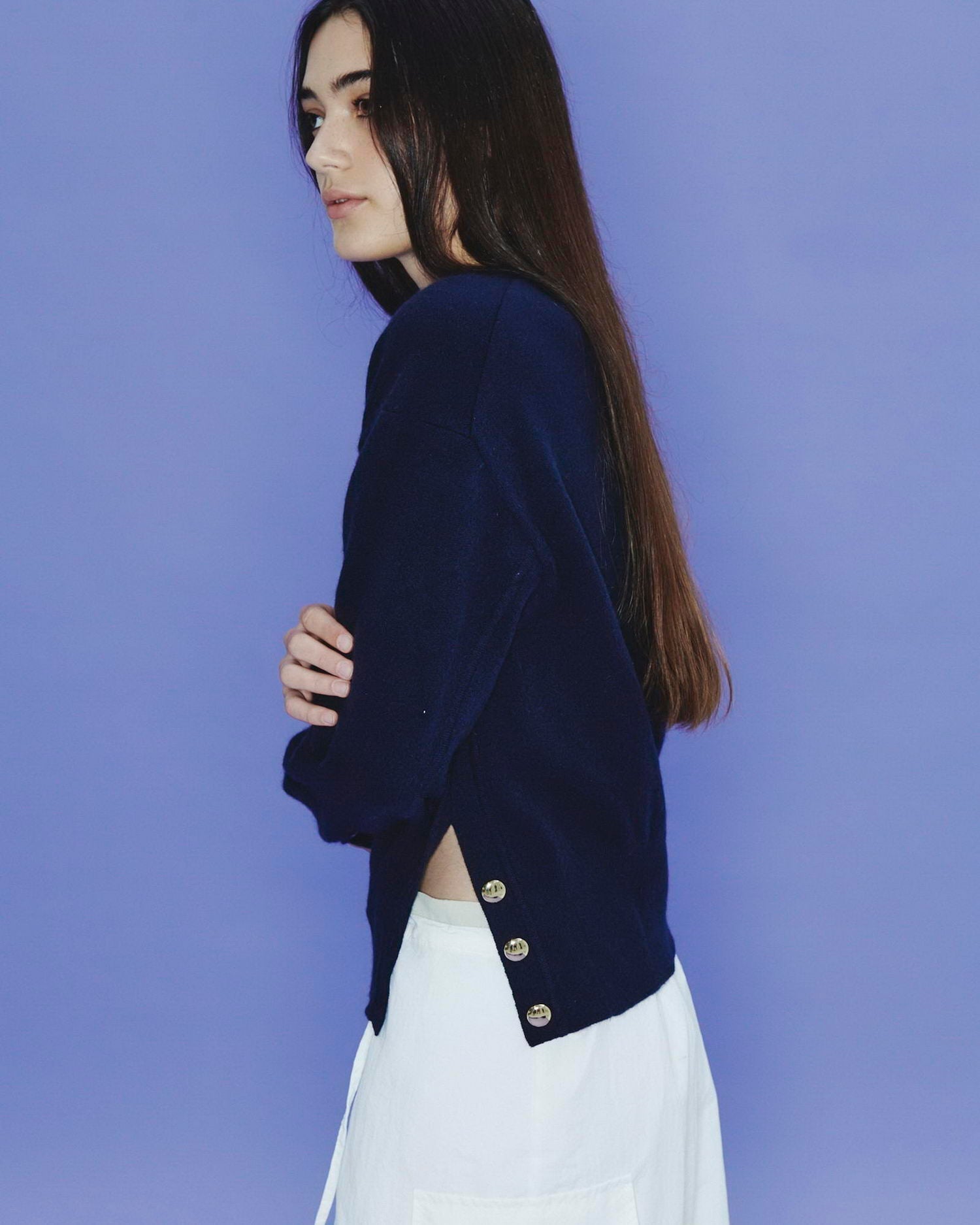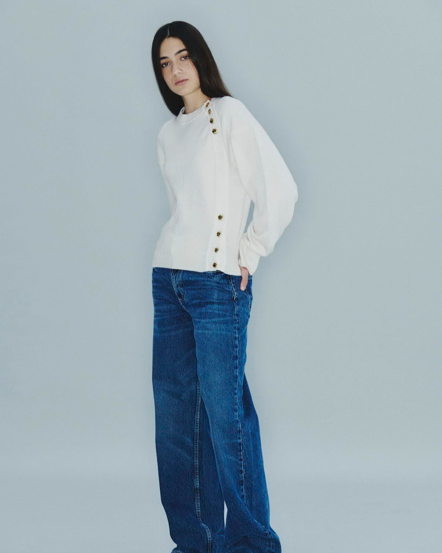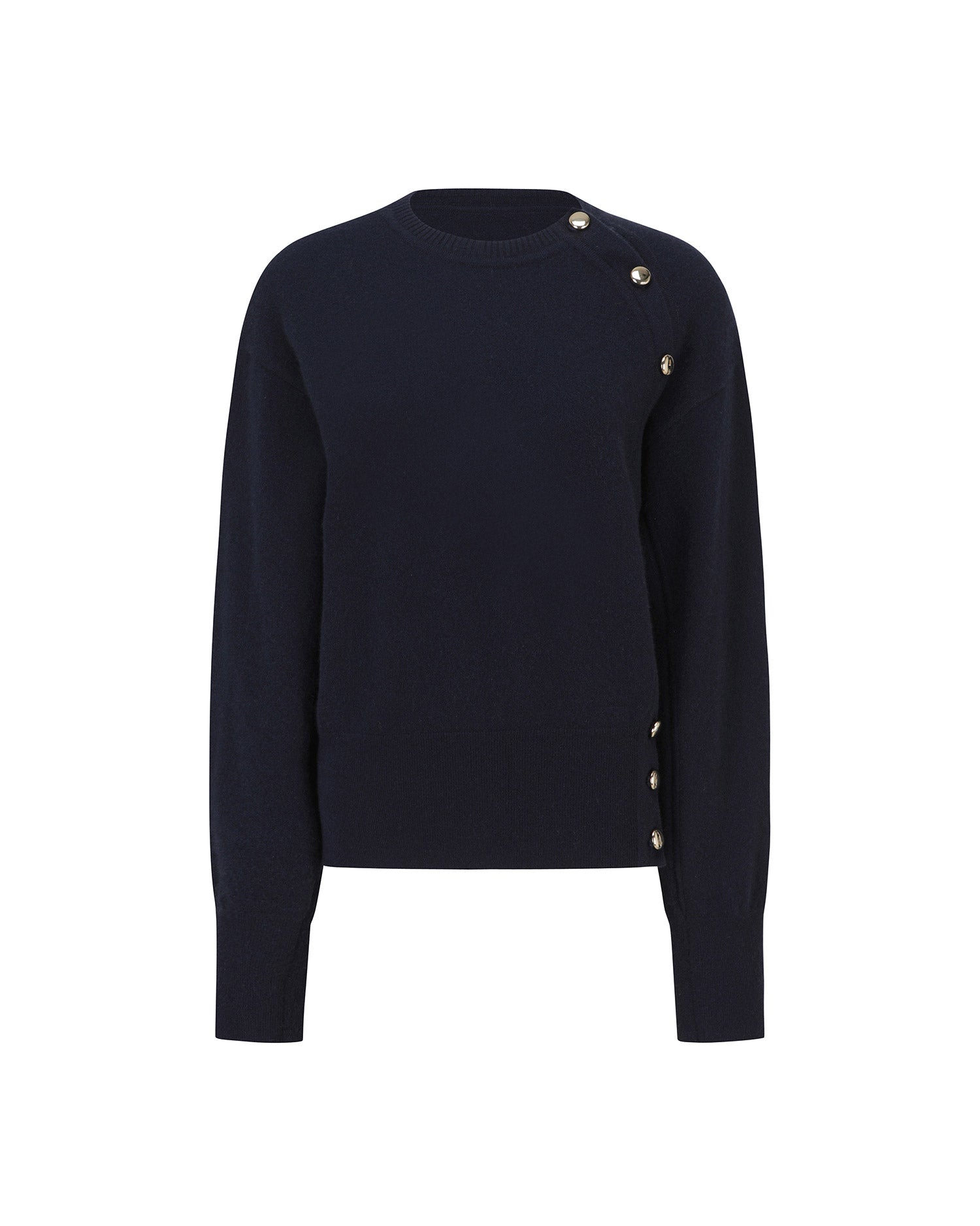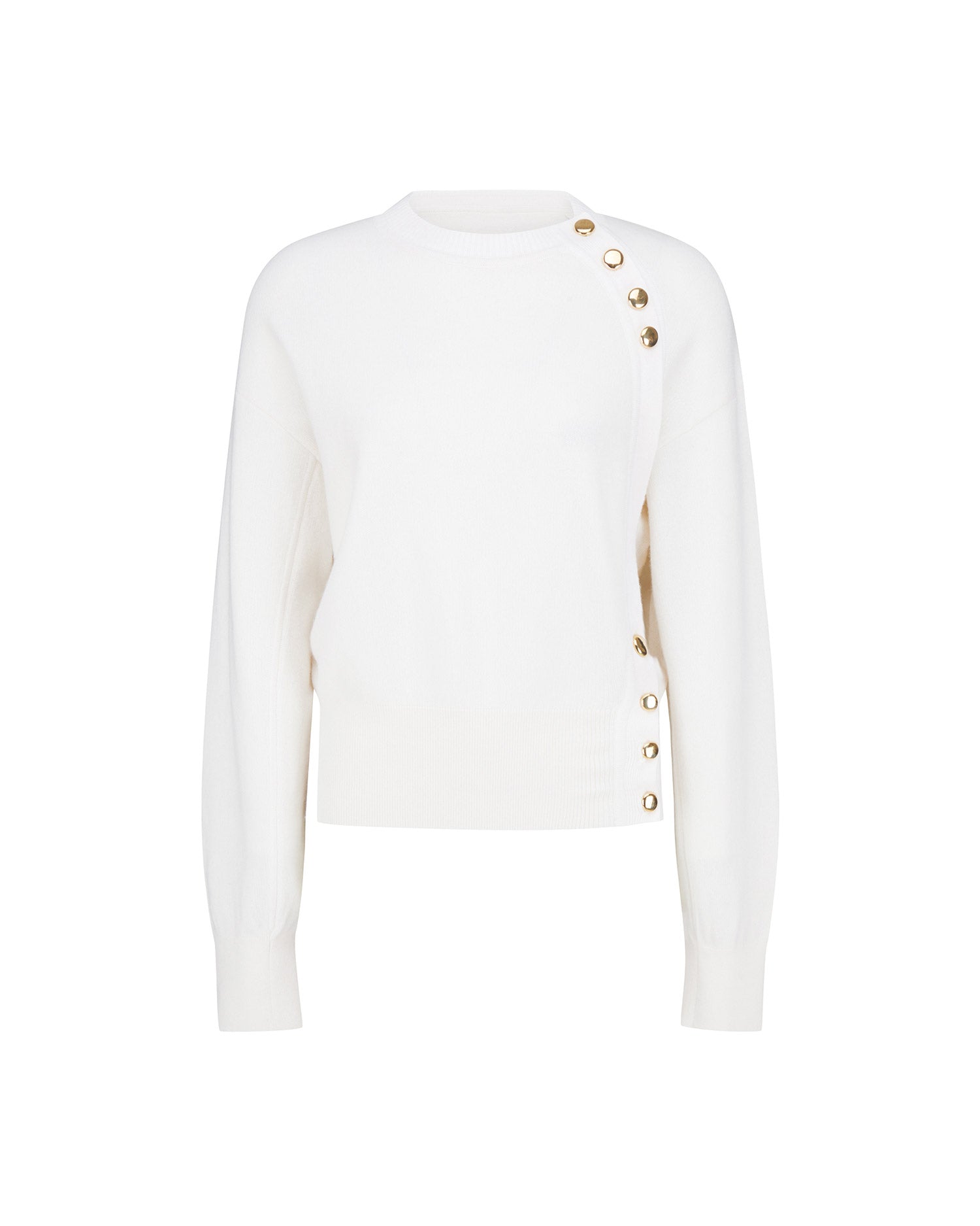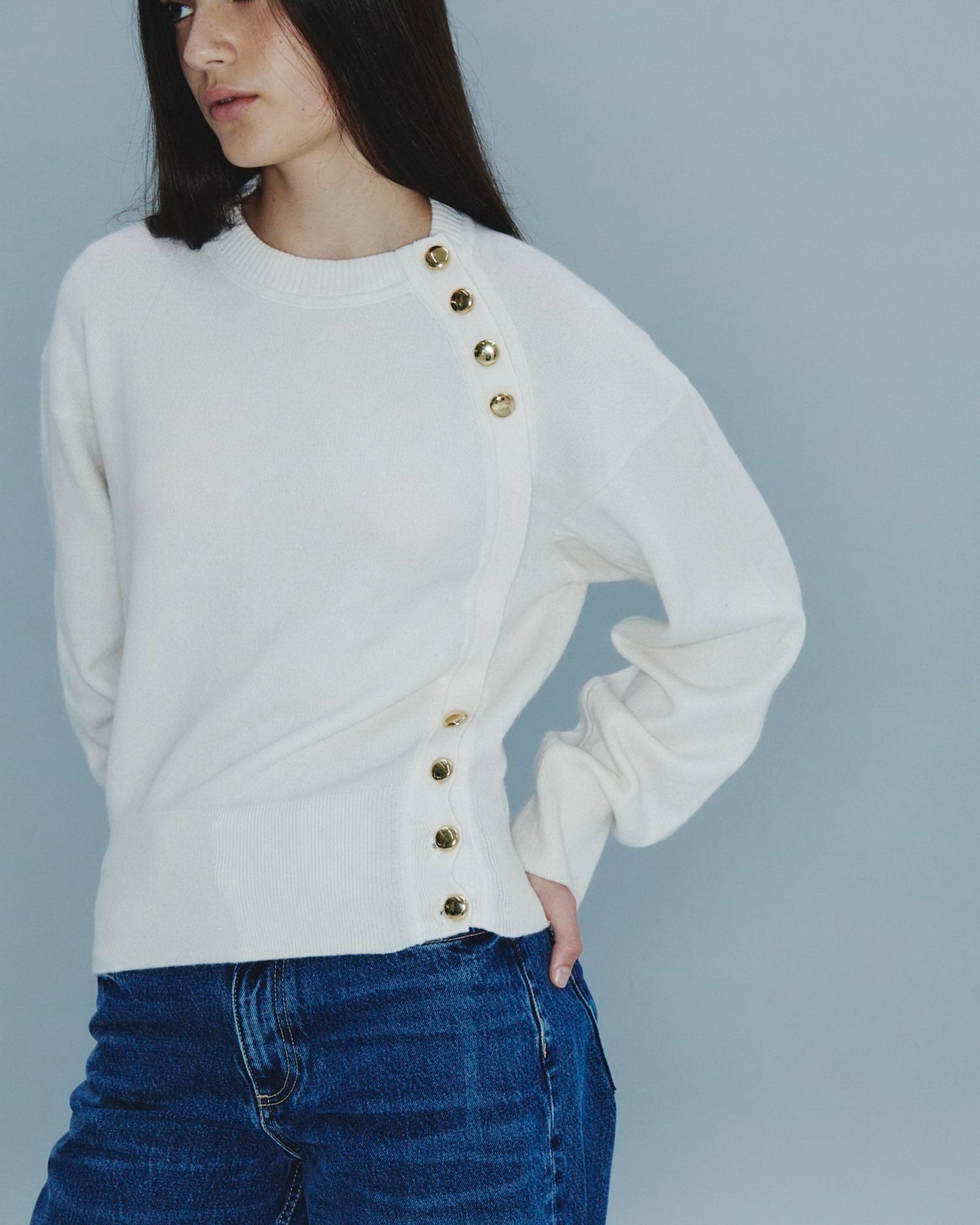Quality sweater with structured silhouette and asymmetric gold buttons. It features drop shoulders, crewneck and ribbed trims which complete your elevated look. Crafted from Mongolian sustainable cashmere, giving it a luxurious and extremely soft texture.
