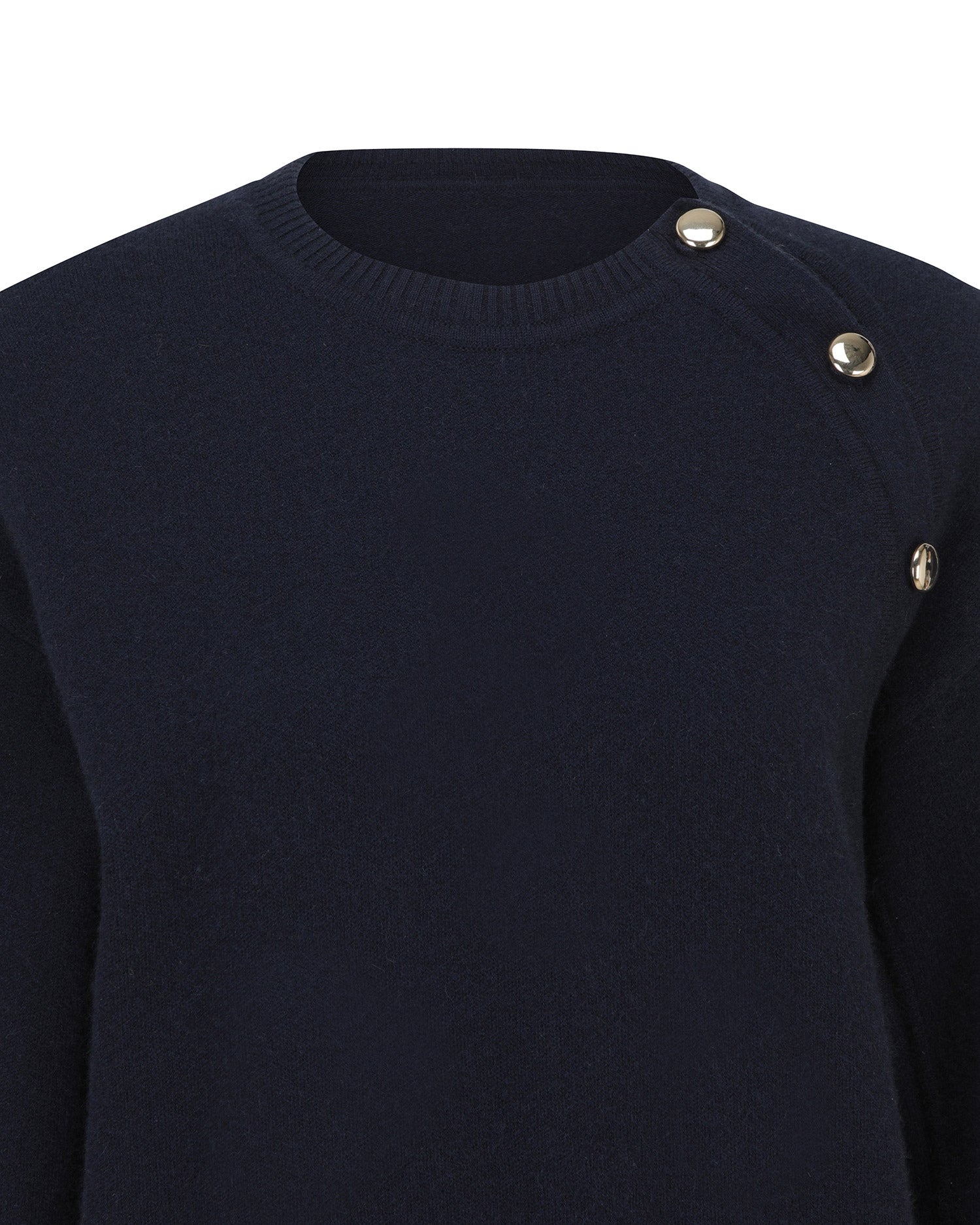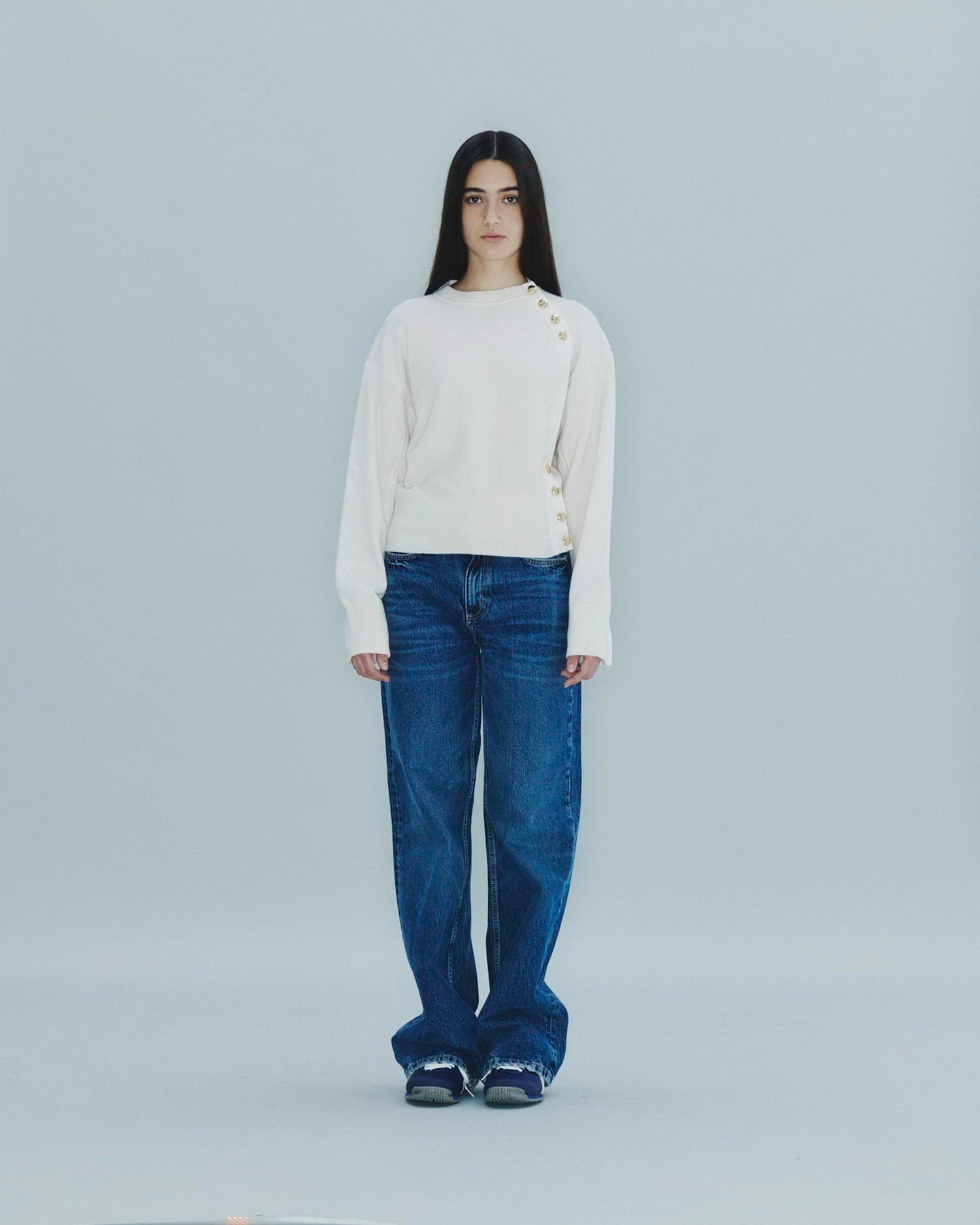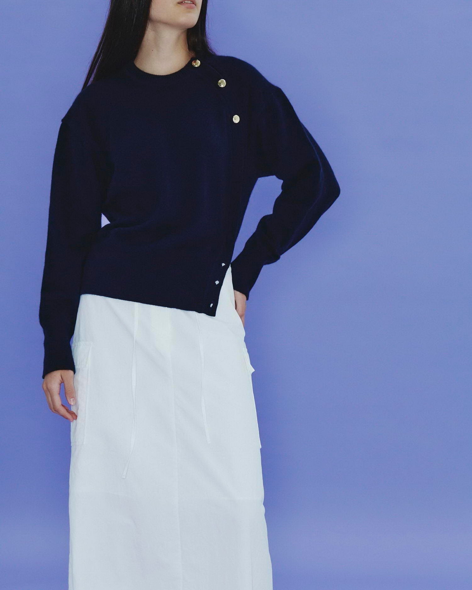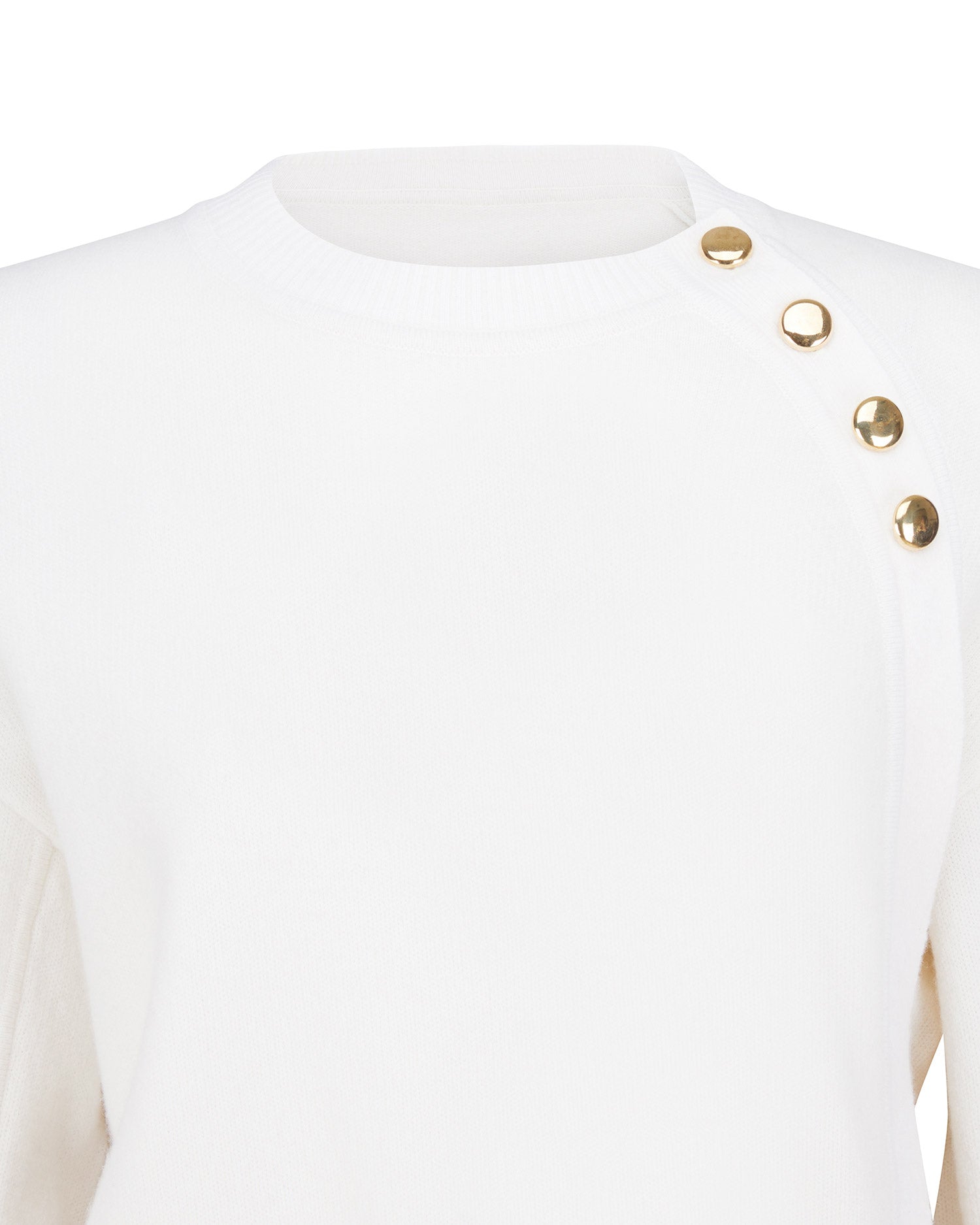 Quality sweater with structured silhouette and asymmetric gold buttons. It features drop shoulders, crewneck and ribbed trims which complete your elevated look. Crafted from Mongolian sustainable cashmere, giving it a luxurious and extremely soft texture.