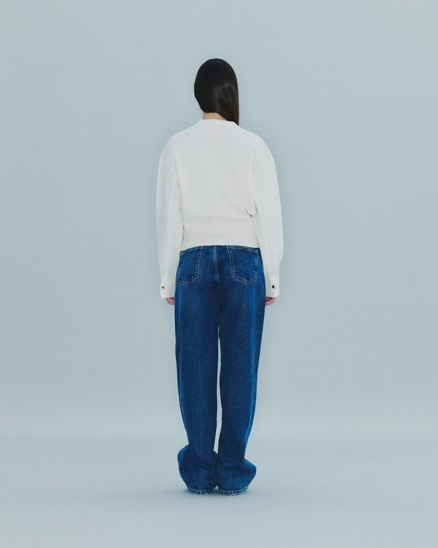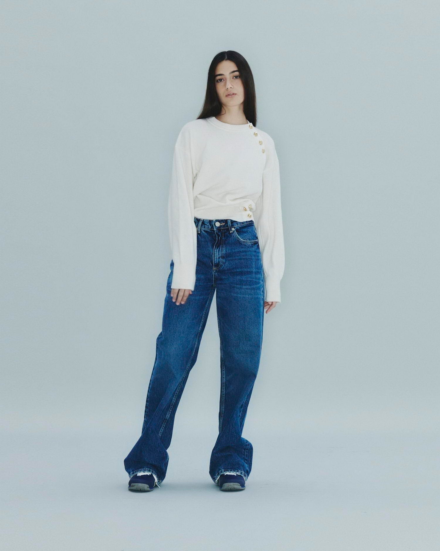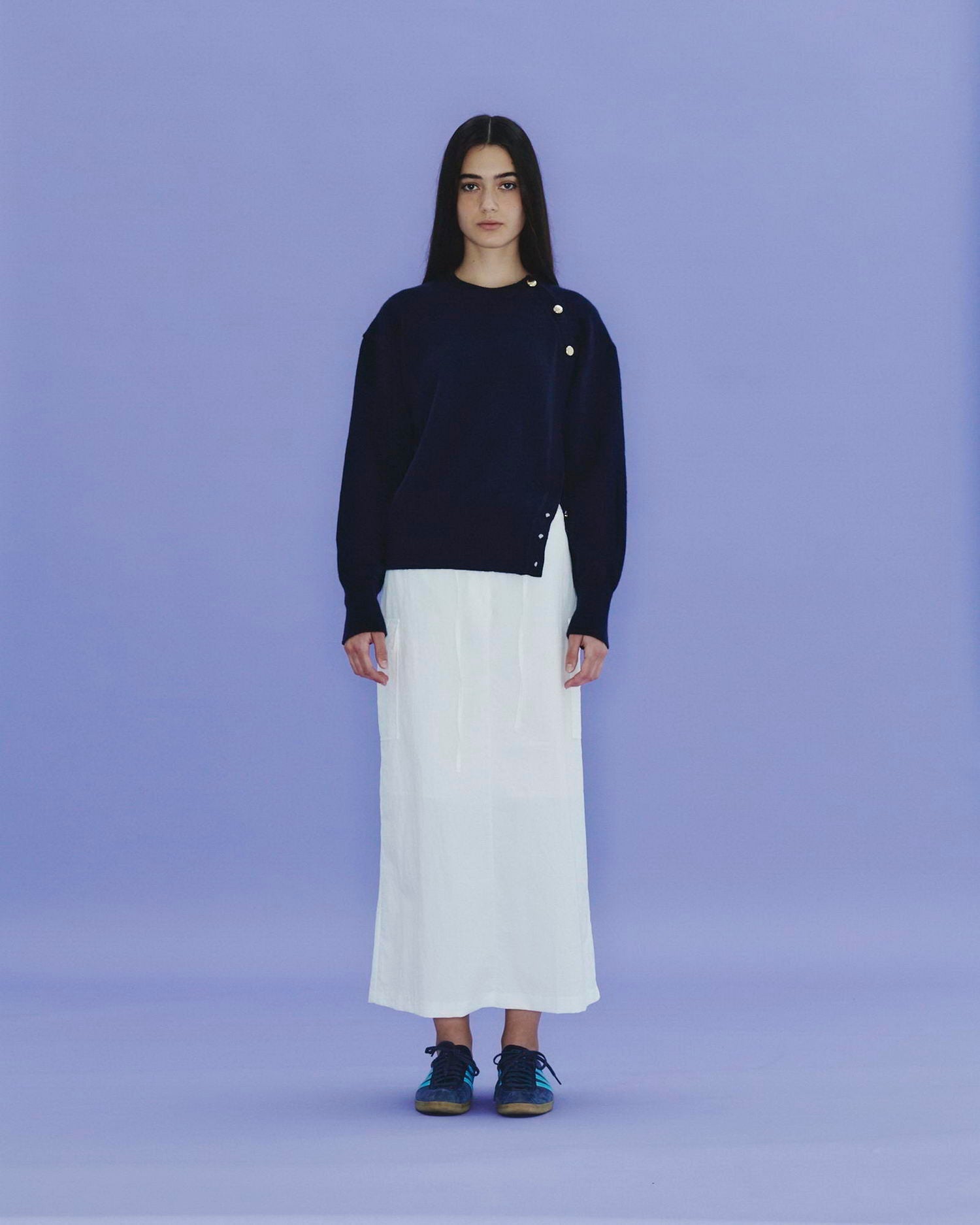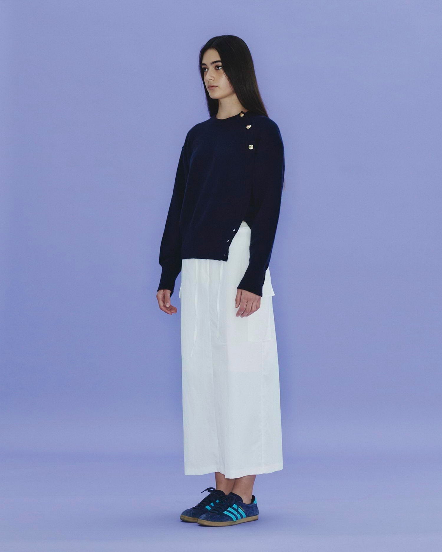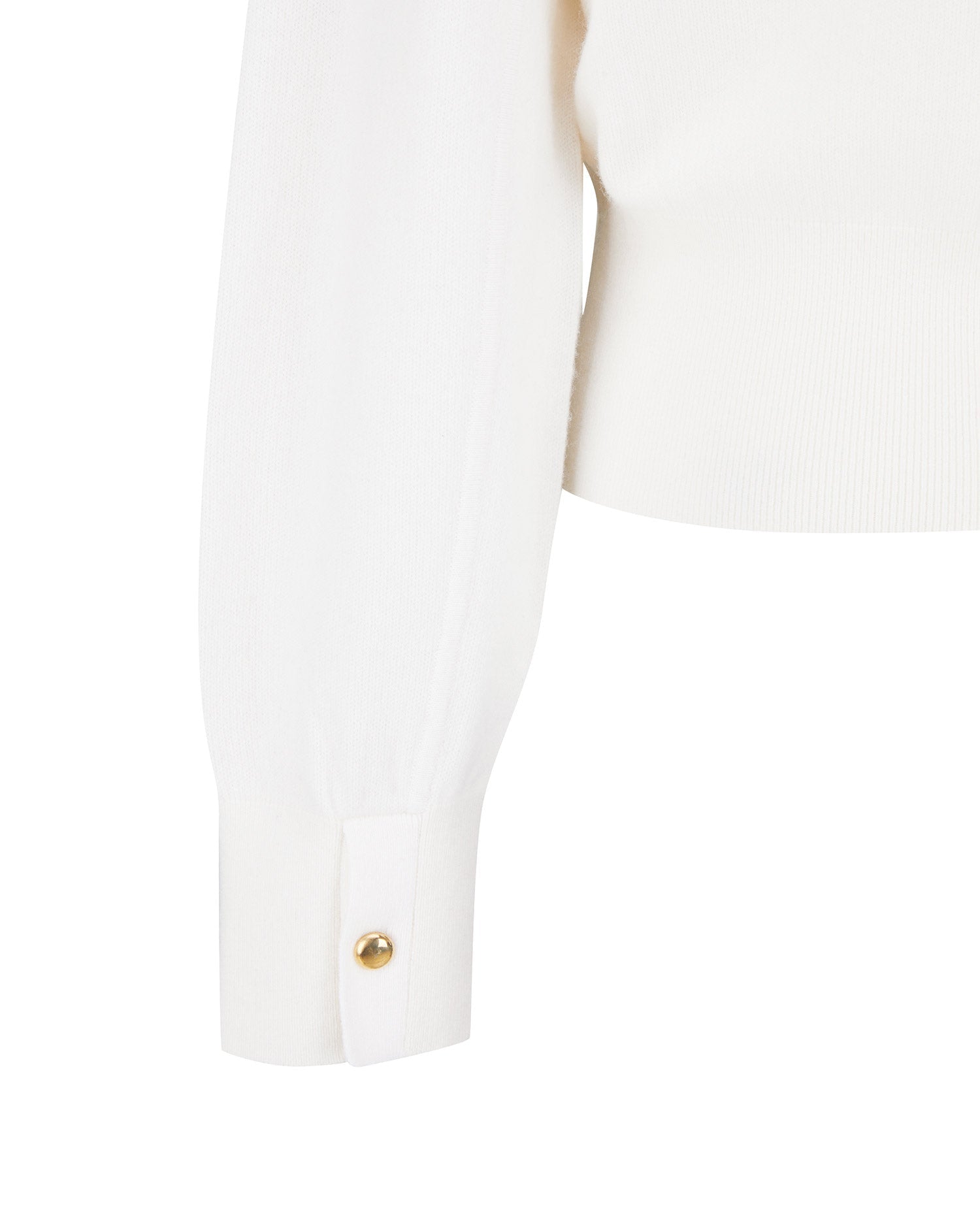 Quality sweater with structured silhouette and asymmetric gold buttons. It features drop shoulders, crewneck and ribbed trims which complete your elevated look. Crafted from Mongolian sustainable cashmere, giving it a luxurious and extremely soft texture.