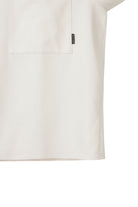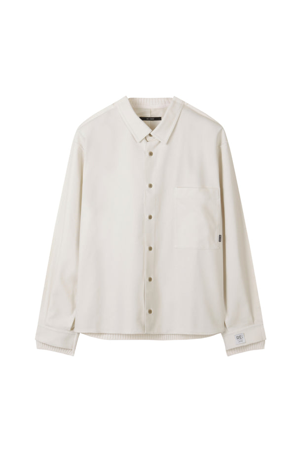 The shirt is crafted from a sturdy yet flexible 100% cotton stock fabric, with a raw-edge finish and asymmetrical details that capture the deconstructed aesthetic. A single chest pocket is complemented by a secondary label with the label's logo. The buttons are eco-friendly "nut" buttons with an engraved logo.