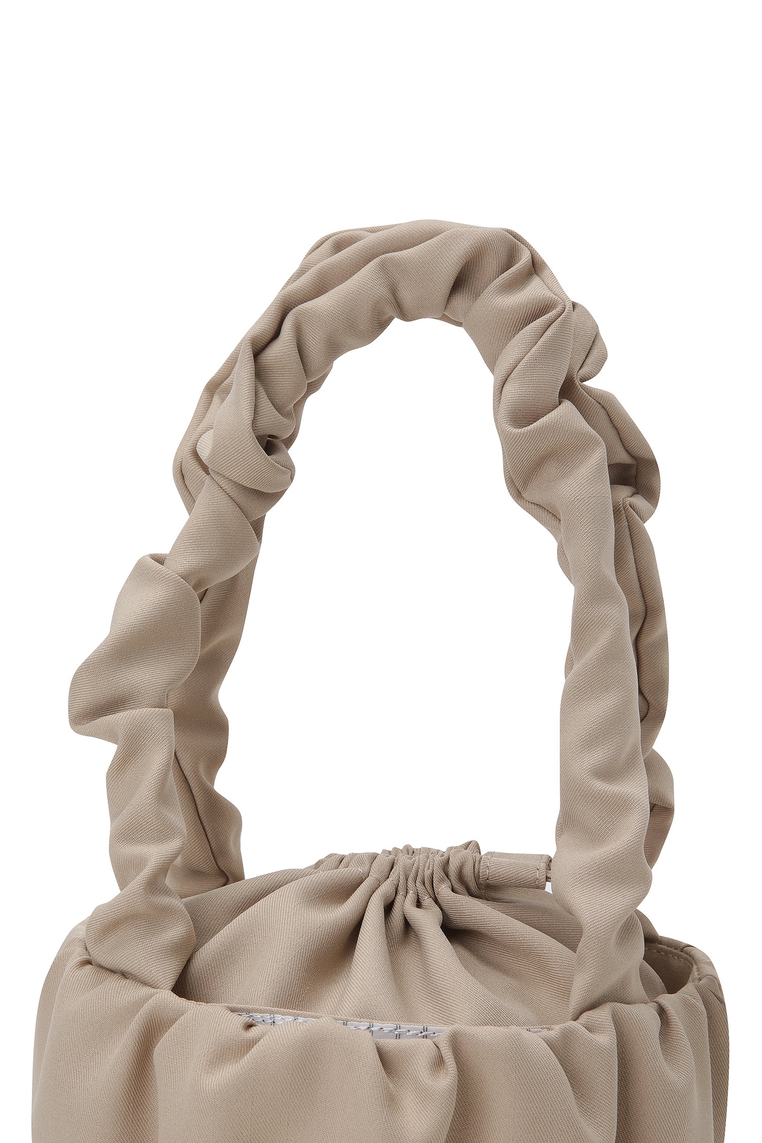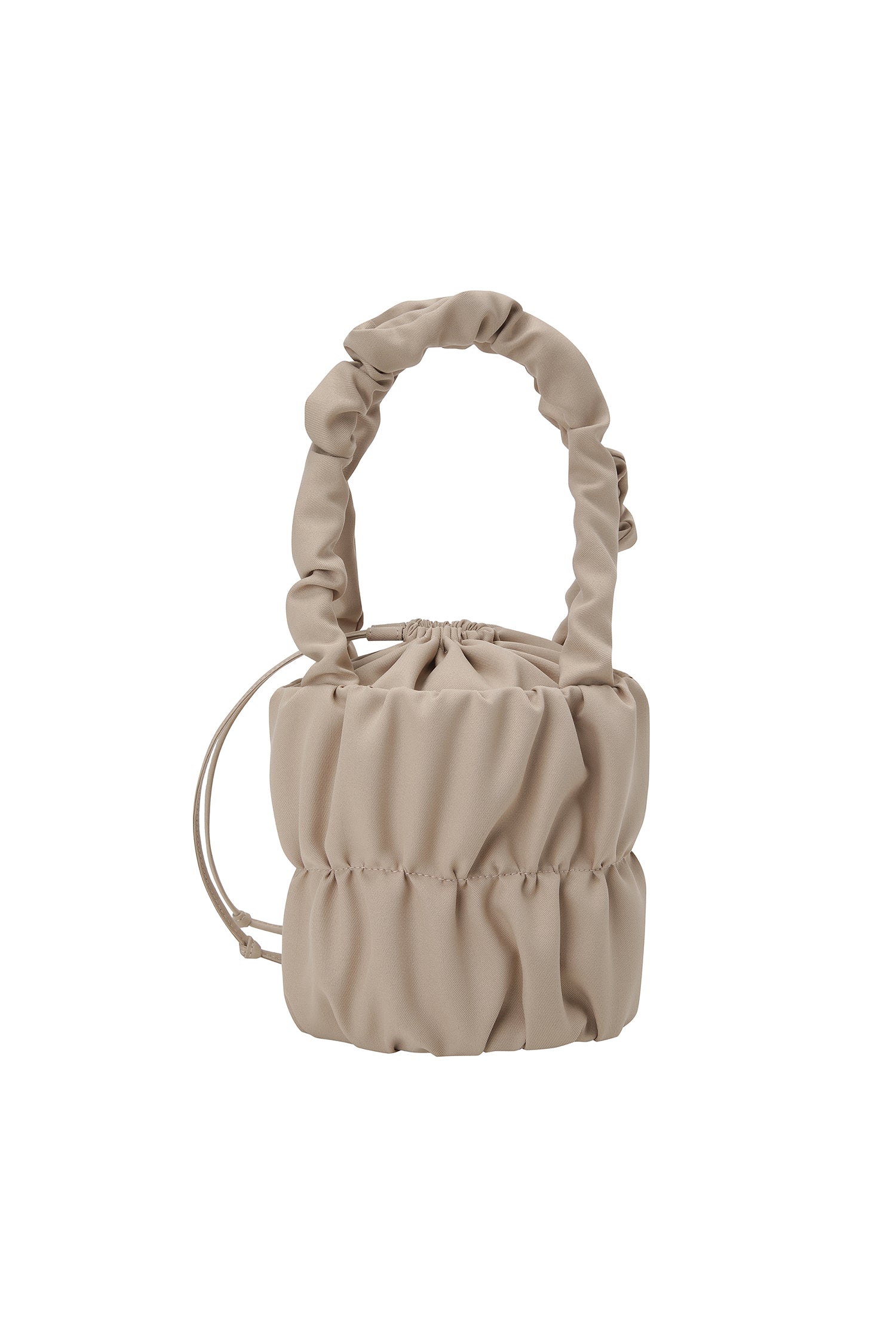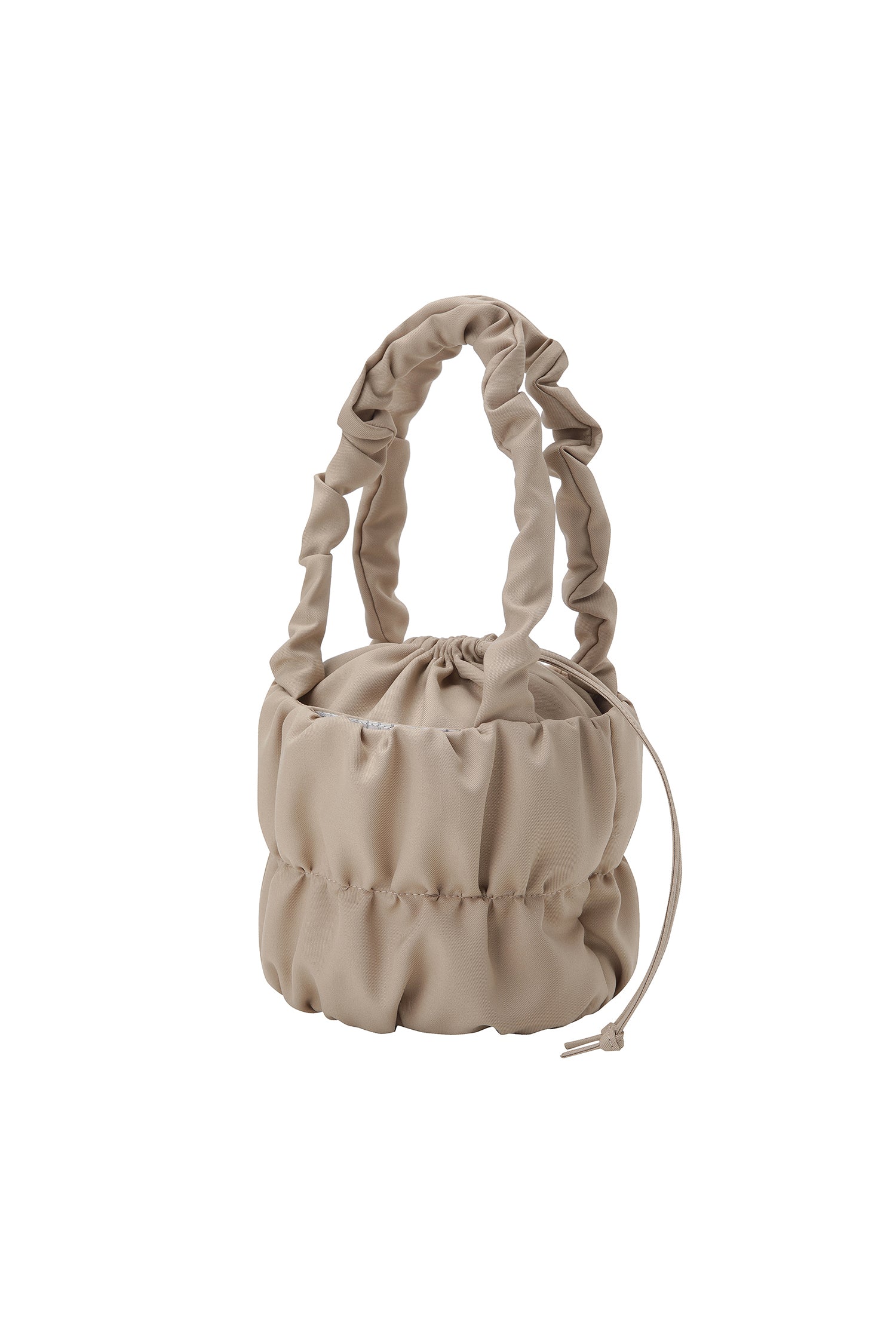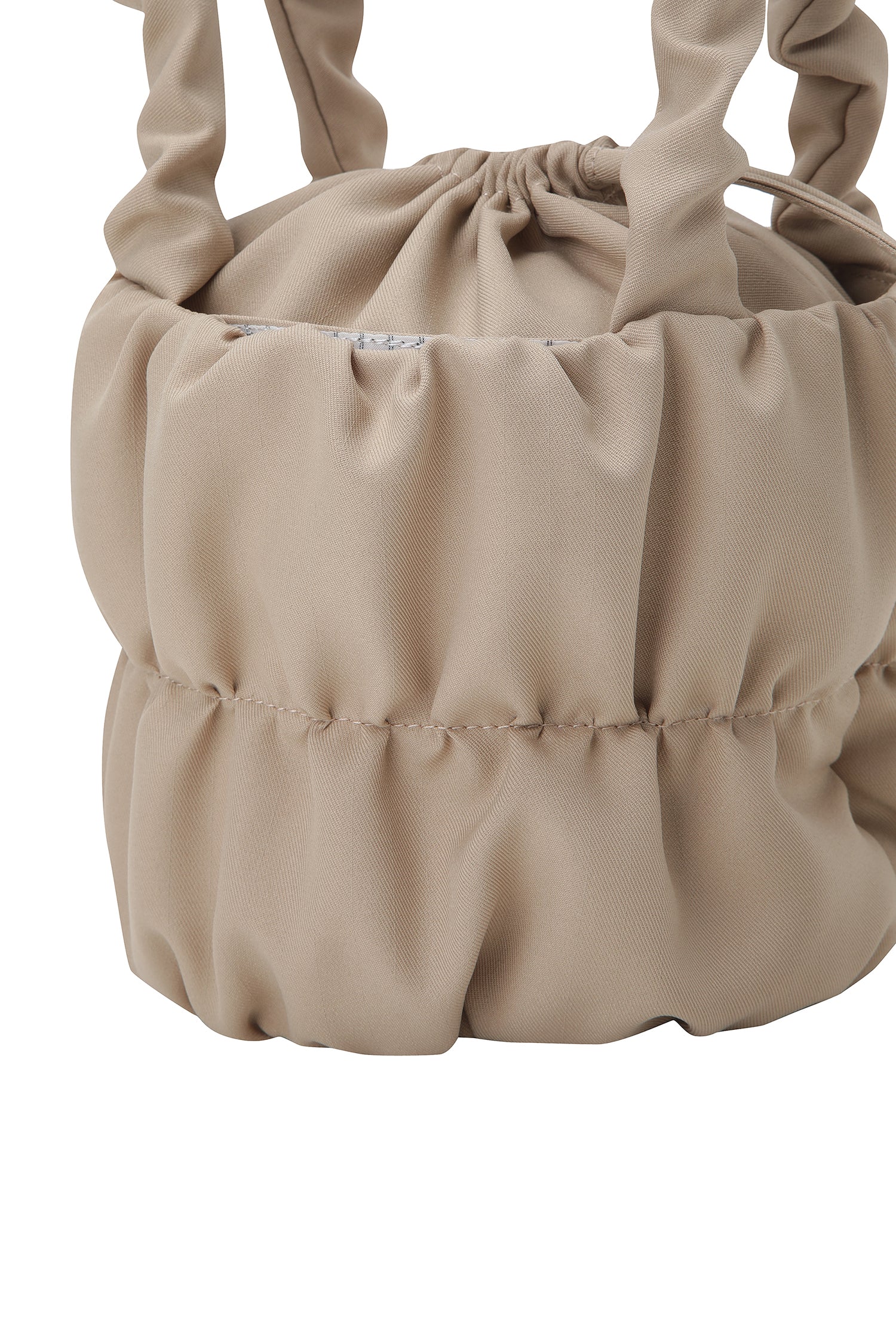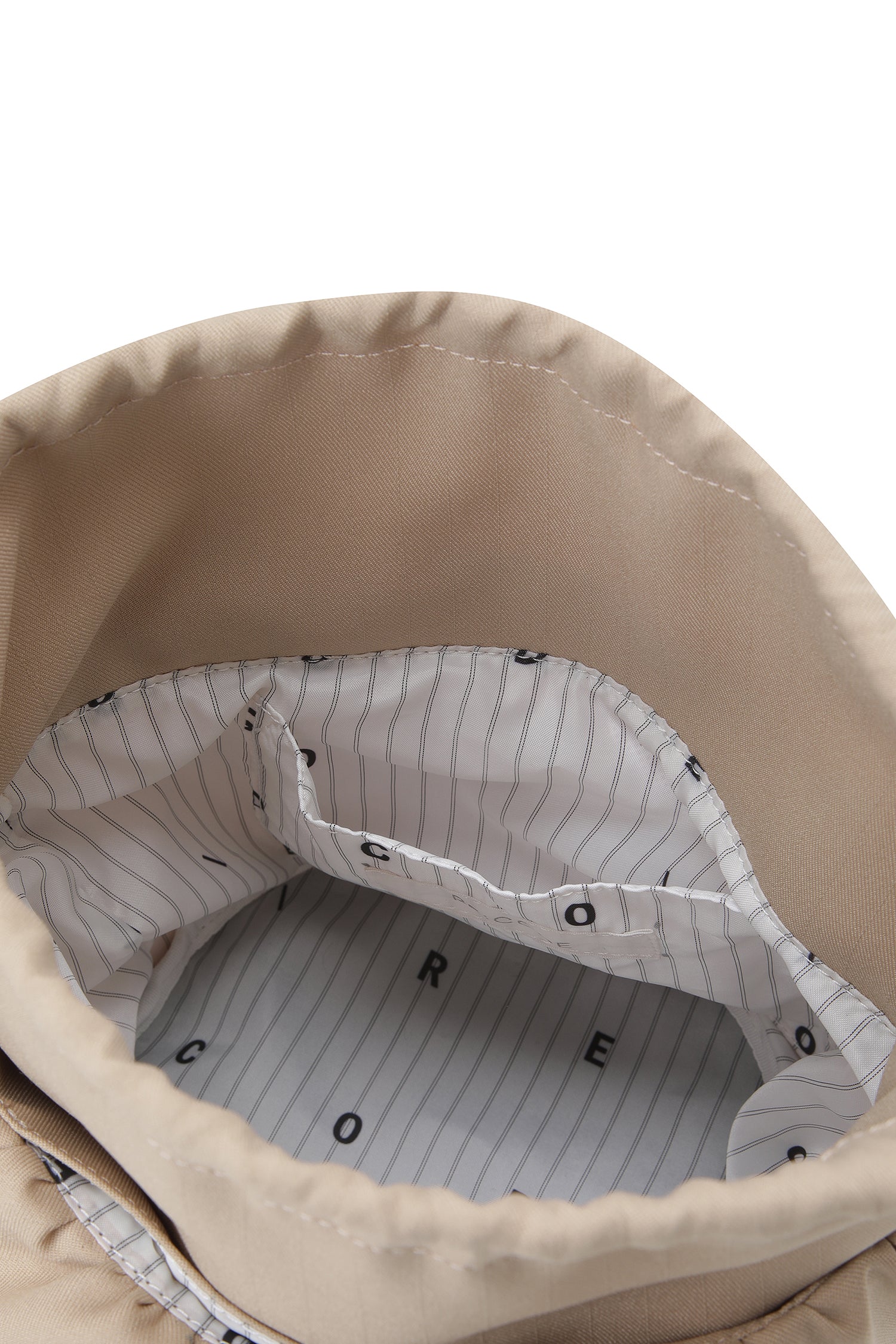 A round bucket bag made of recycled polyester fabric. A design that can be worn in two ways: shoulder and tote. Number print inspired by patterned paper is used on the inner lining.