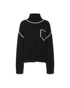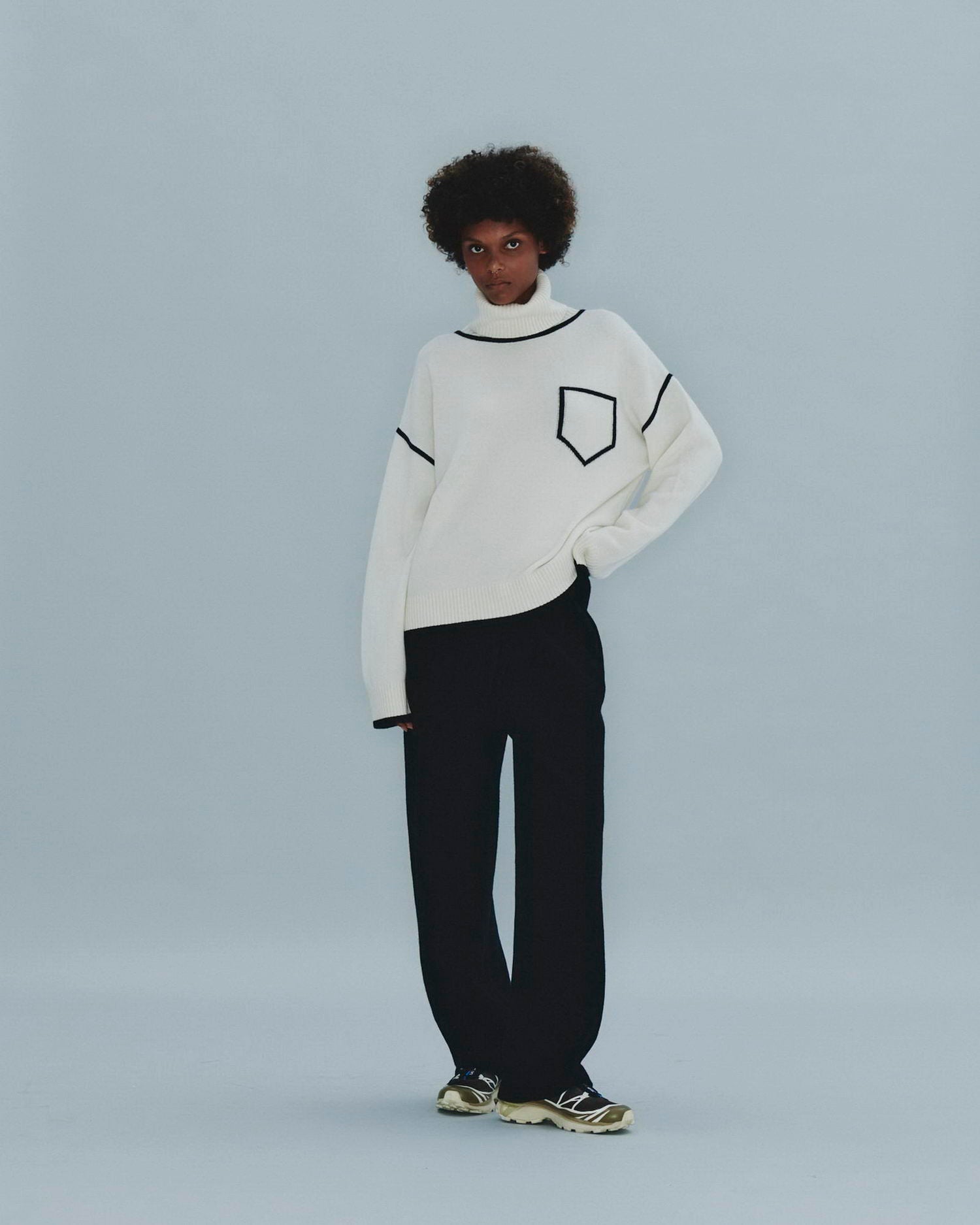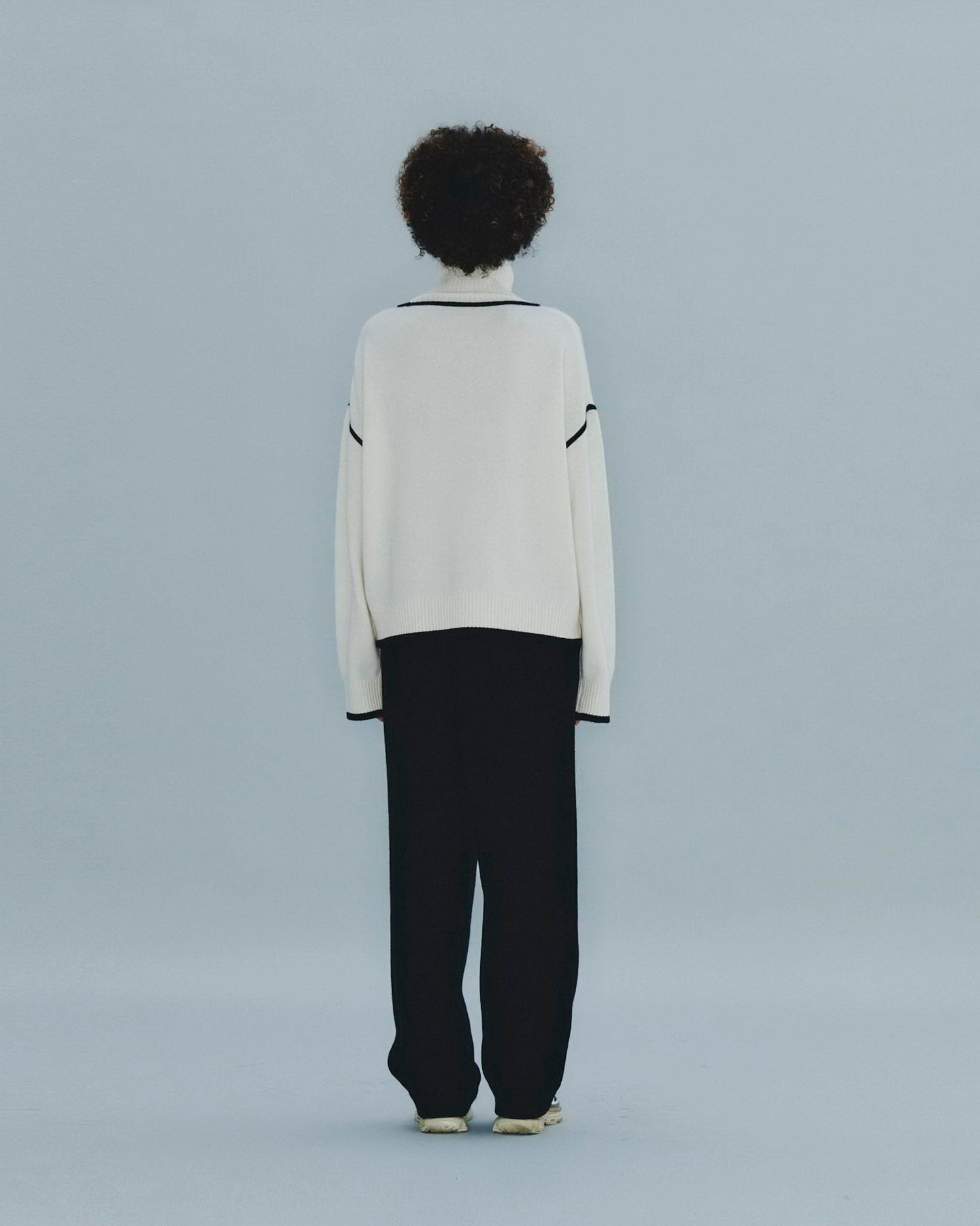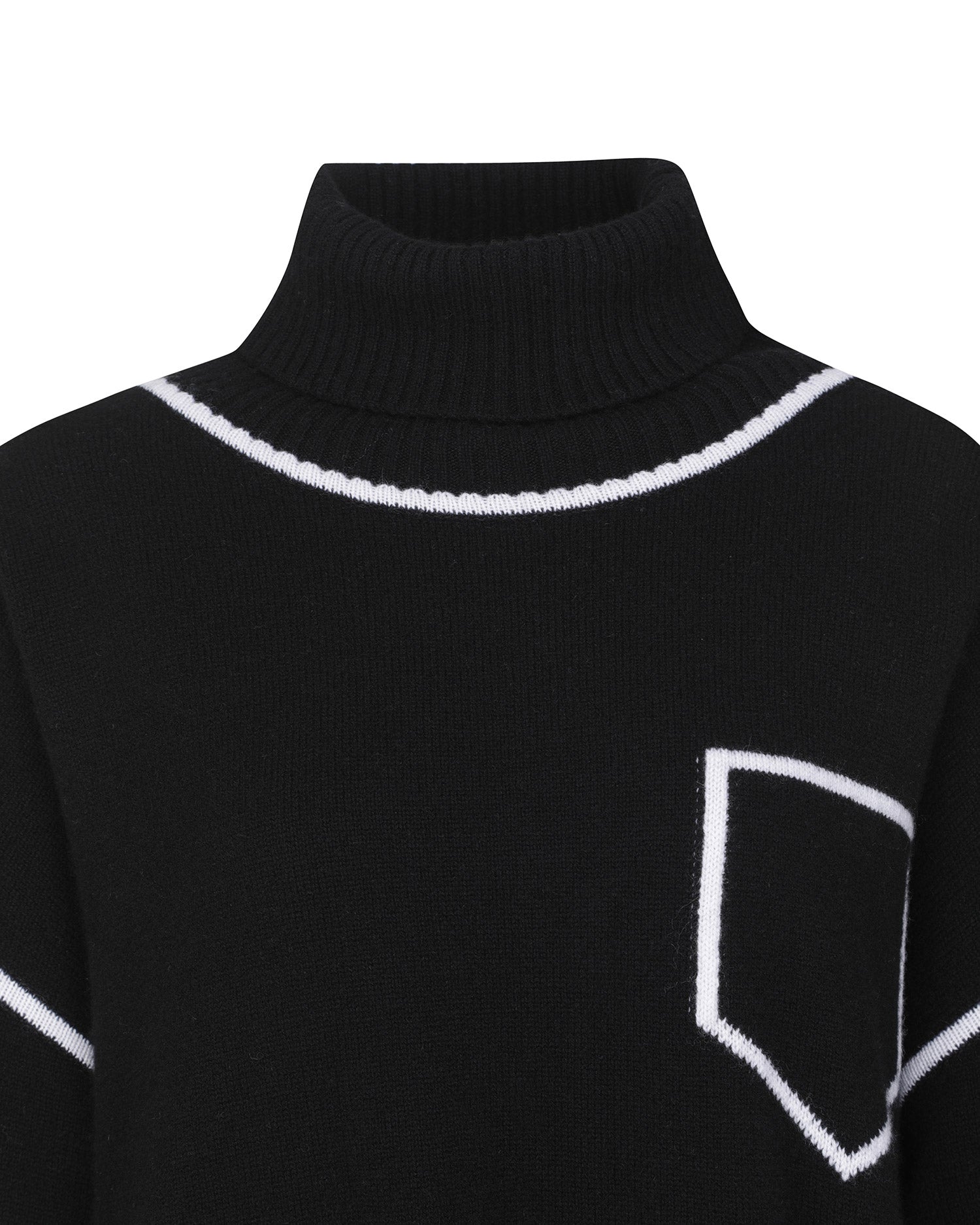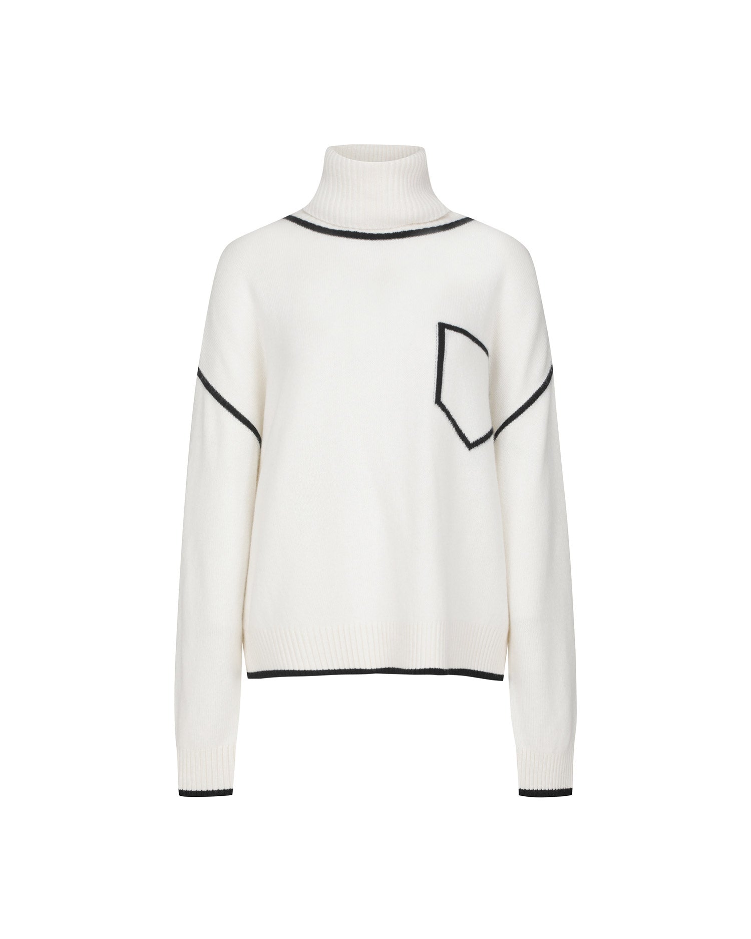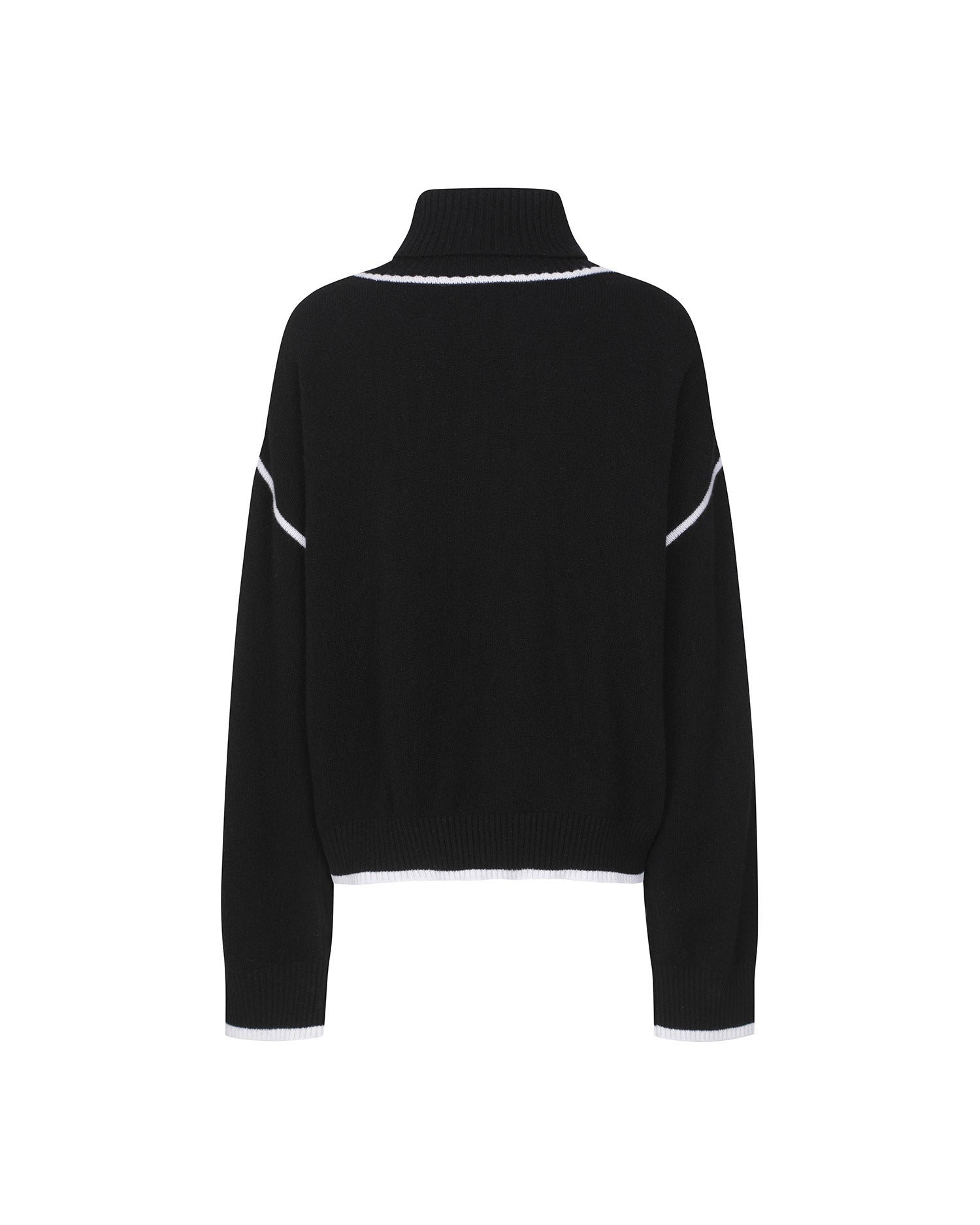 Modern and minimal turtleneck sweater with contrast intarsia. Dropped shoulders and loose sleeves enhance the luxurious and laid-back silhouette. Made of 100% Mongolian sustainable cashmere, giving it a extremely soft touch.