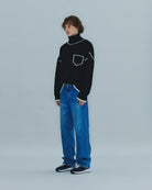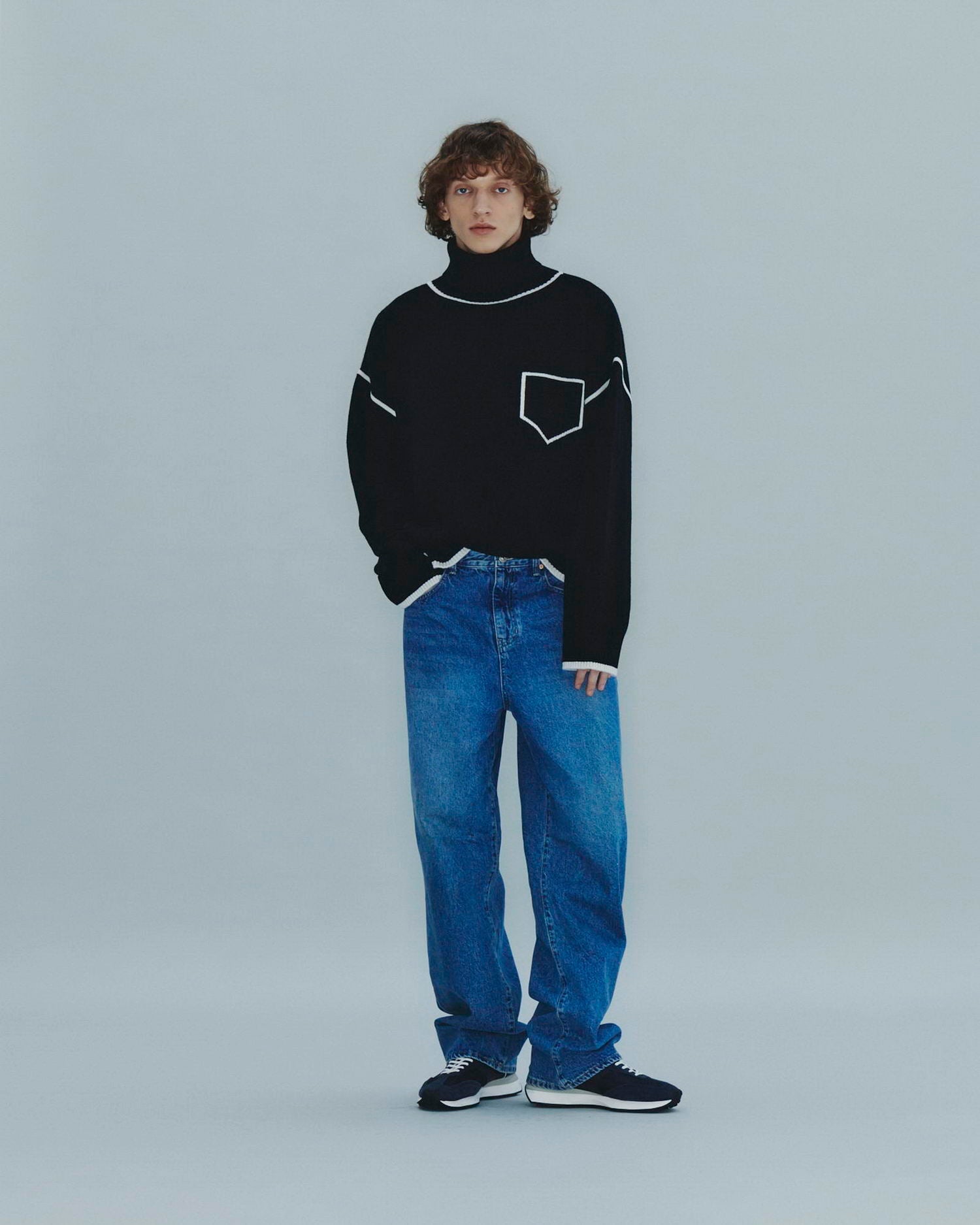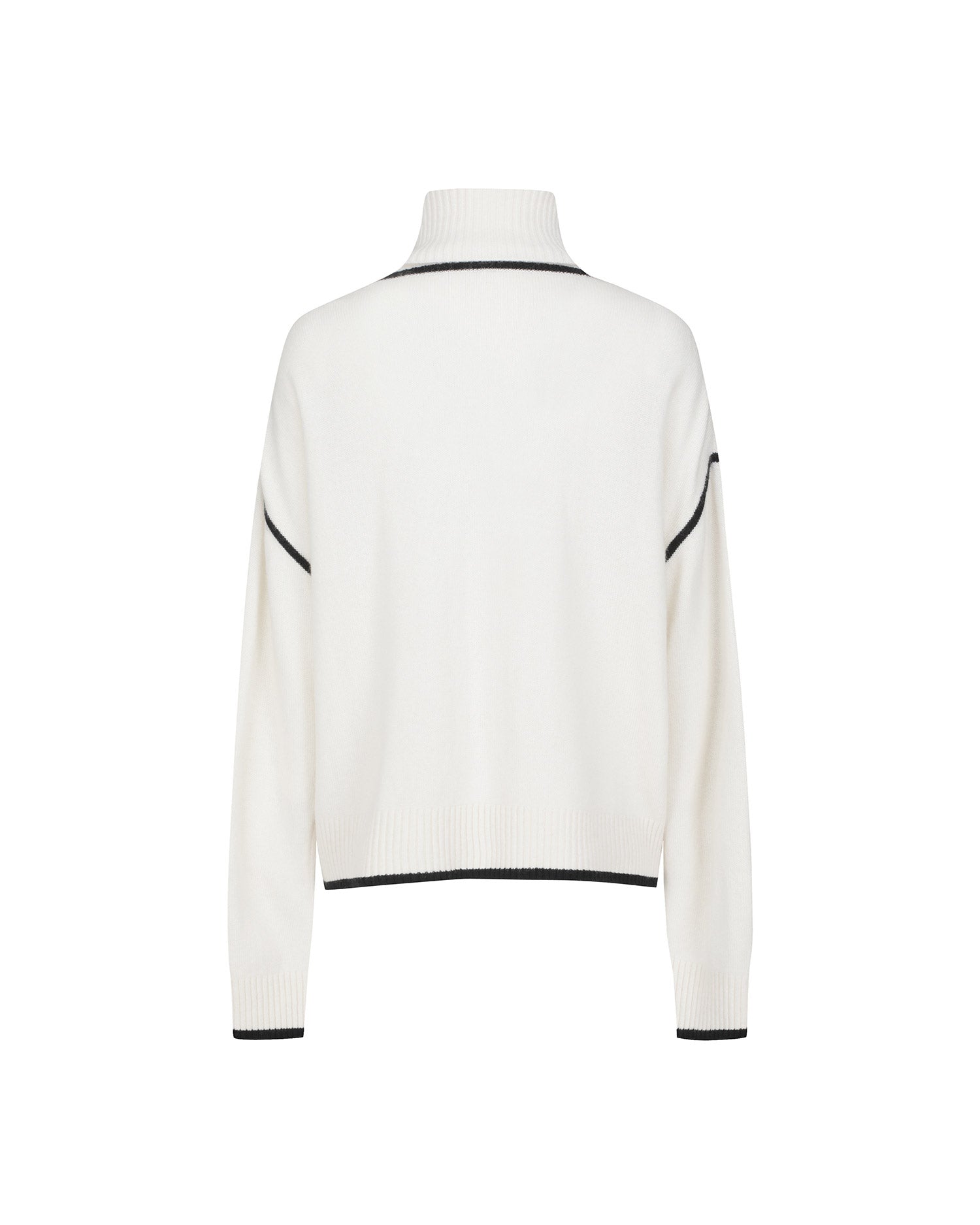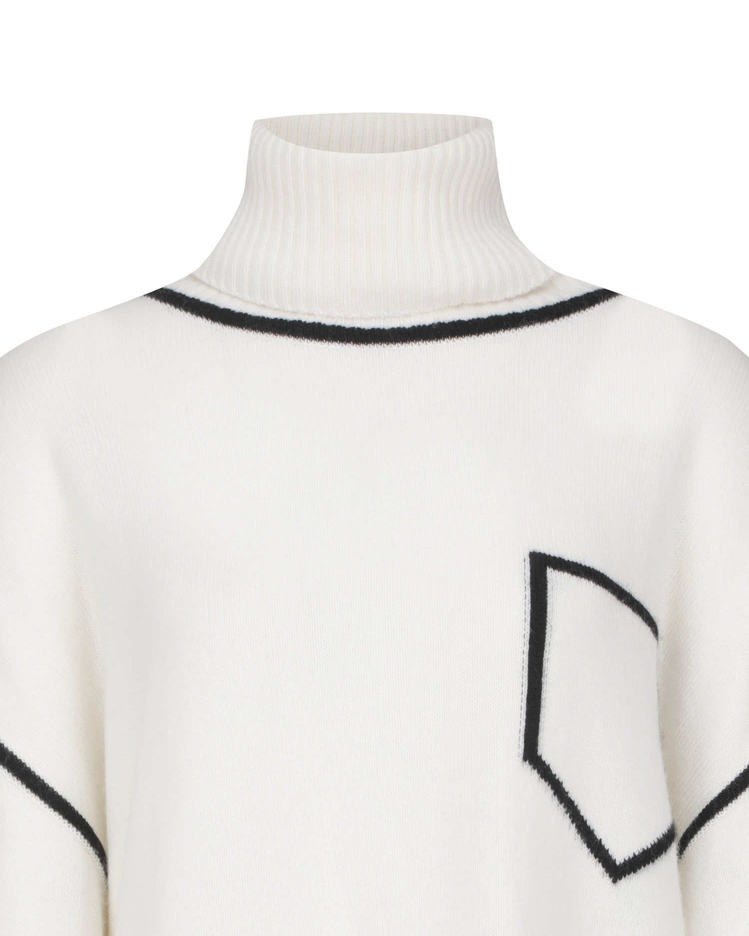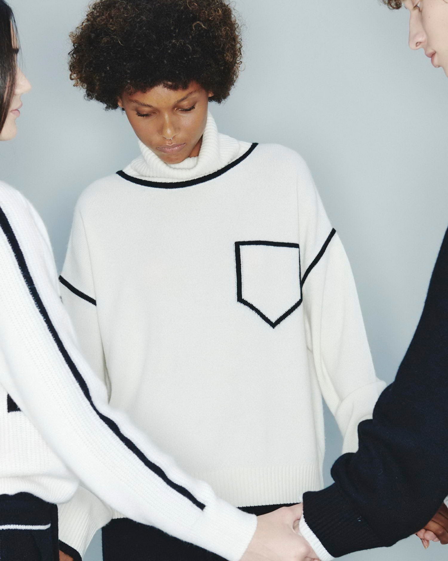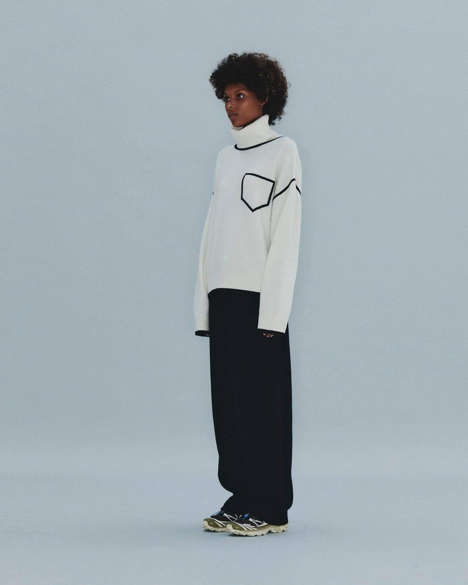 Modern and minimal turtleneck sweater with contrast intarsia. Dropped shoulders and loose sleeves enhance the luxurious and laid-back silhouette. Made of 100% Mongolian sustainable cashmere, giving it a extremely soft touch.