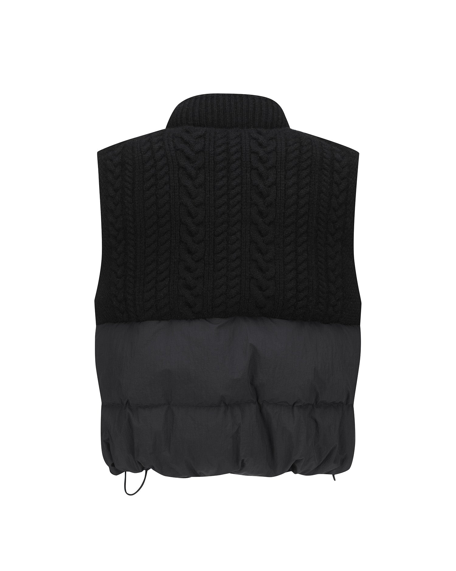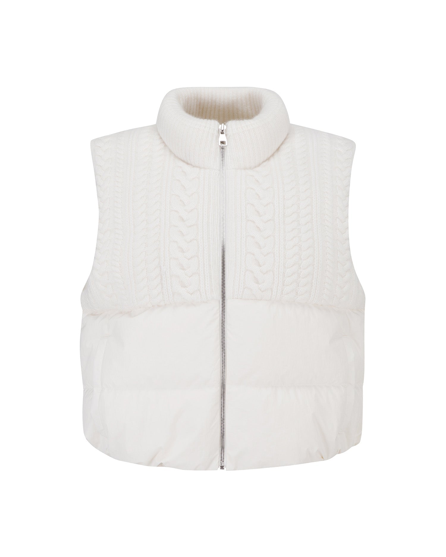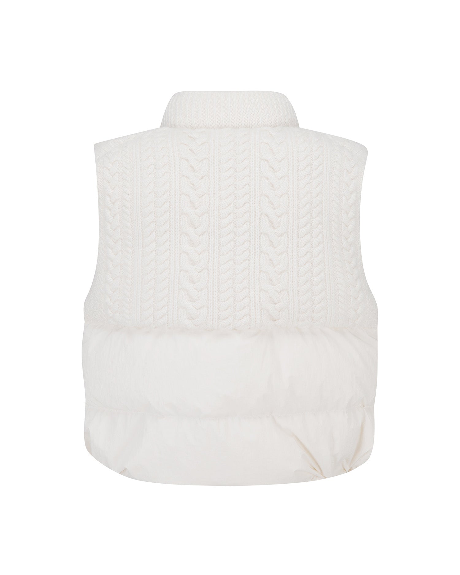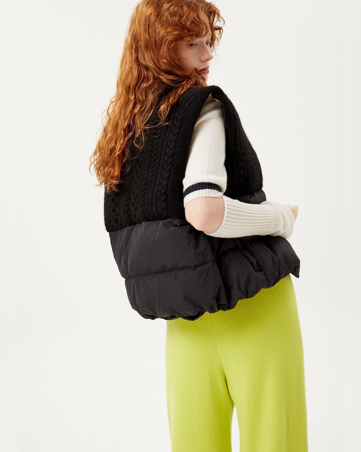 Puffer Vest with a luxurious cable-knit design. Experience lightweight and coziness, making it perfect for any occasions, complementing both casual and elegant looks. The adjustable bottom string allows you to effortlessly tailor the silhouette to your preference. Crafted from 100% sustainable cashmere and recycled goose down.