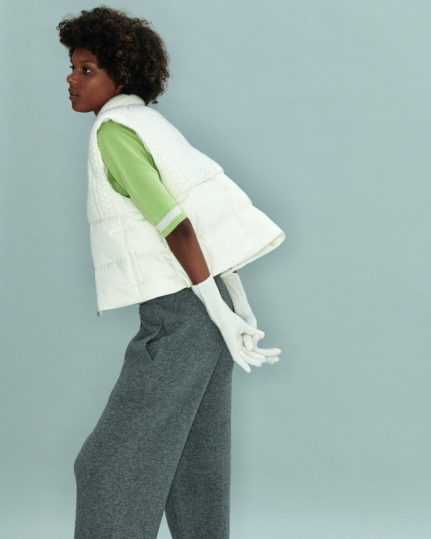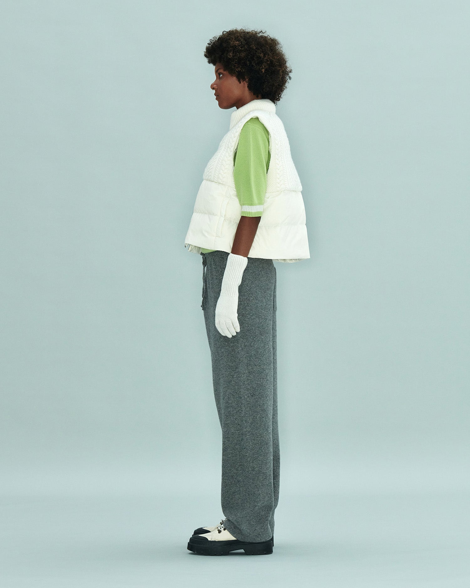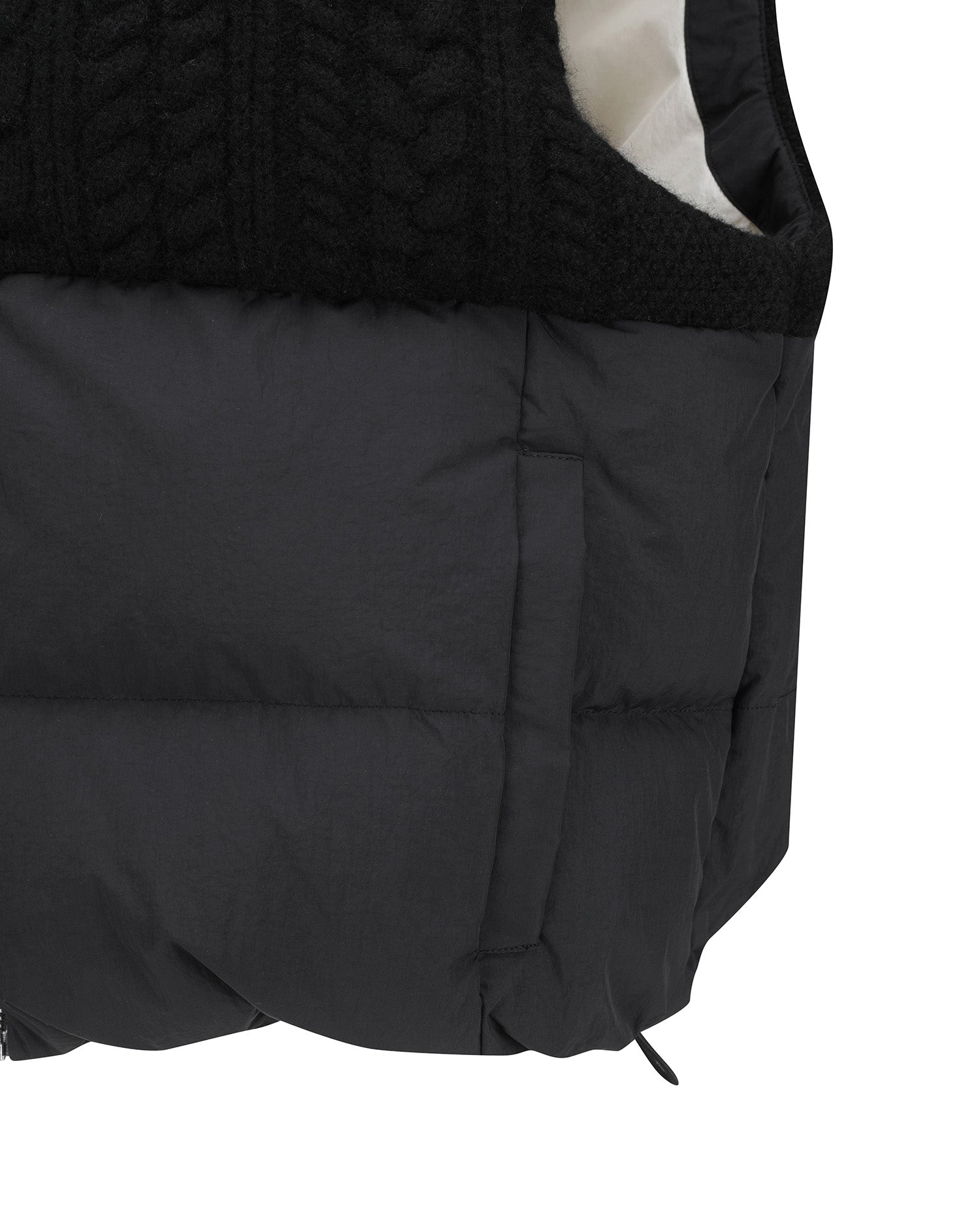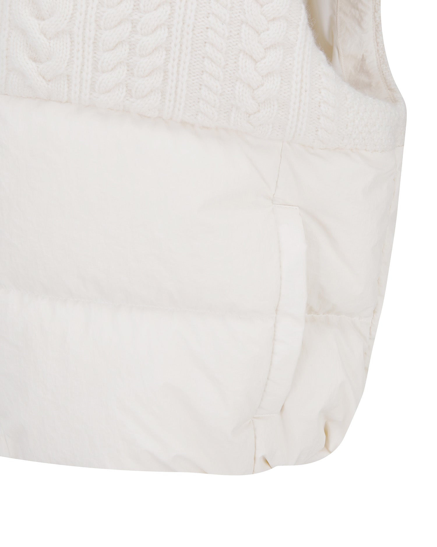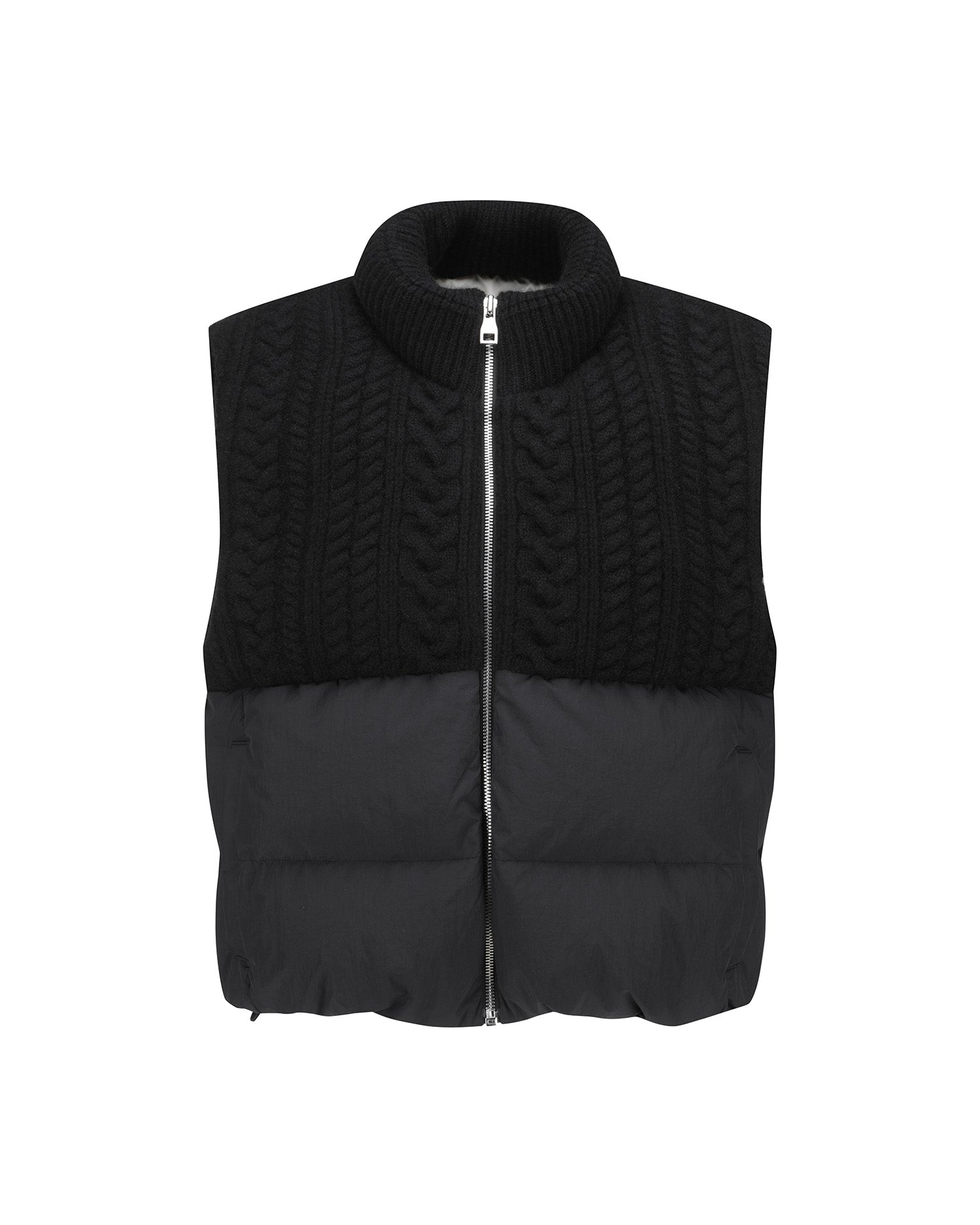 Puffer Vest with a luxurious cable-knit design. Experience lightweight and coziness, making it perfect for any occasions, complementing both casual and elegant looks. The adjustable bottom string allows you to effortlessly tailor the silhouette to your preference. Crafted from 100% sustainable cashmere and recycled goose down.
