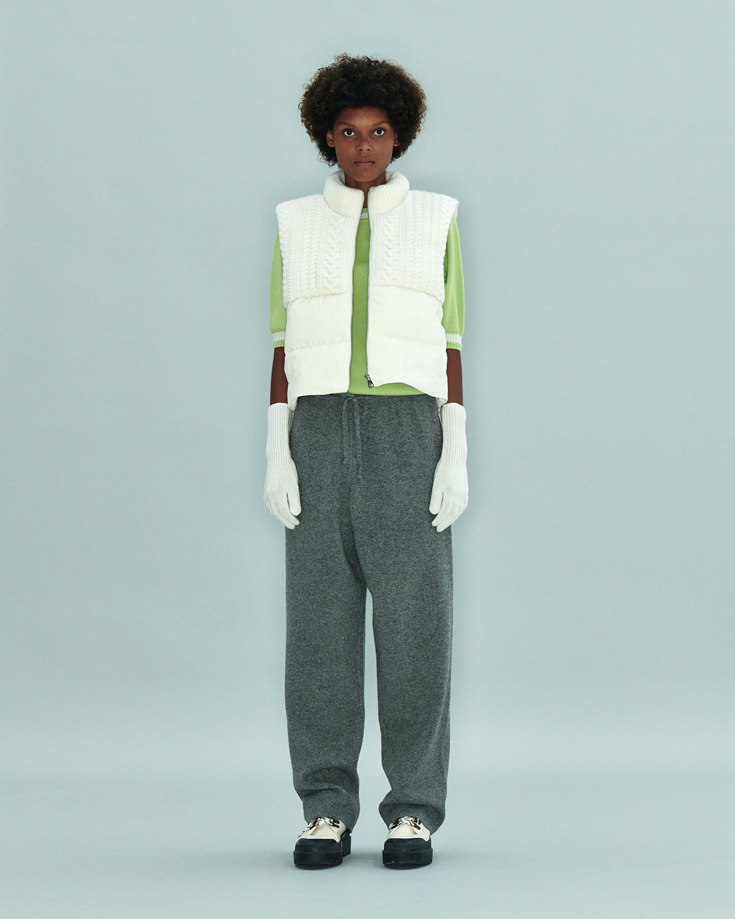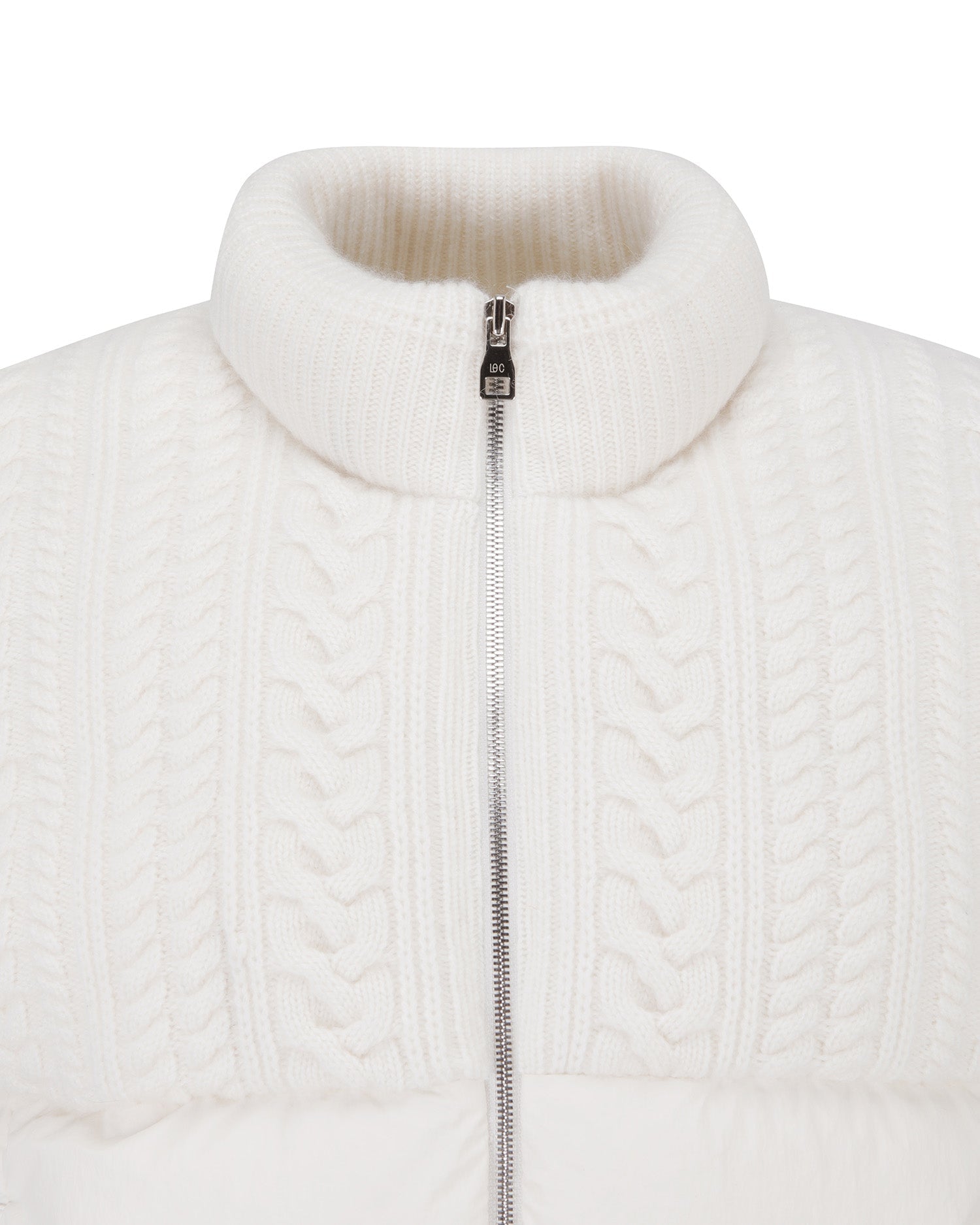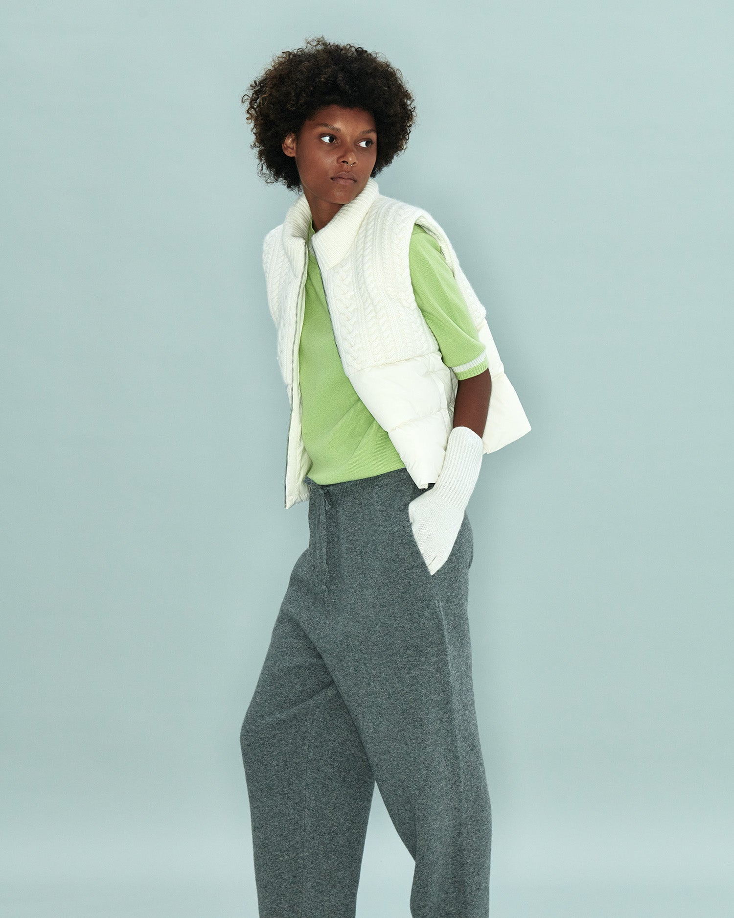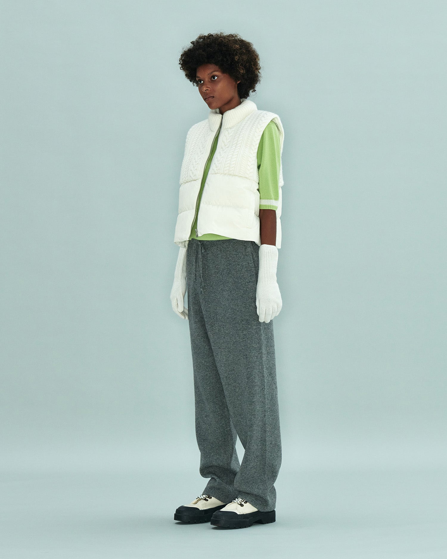 Puffer Vest with a luxurious cable-knit design. Experience lightweight and coziness, making it perfect for any occasions, complementing both casual and elegant looks. The adjustable bottom string allows you to effortlessly tailor the silhouette to your preference. Crafted from 100% sustainable cashmere and recycled goose down.