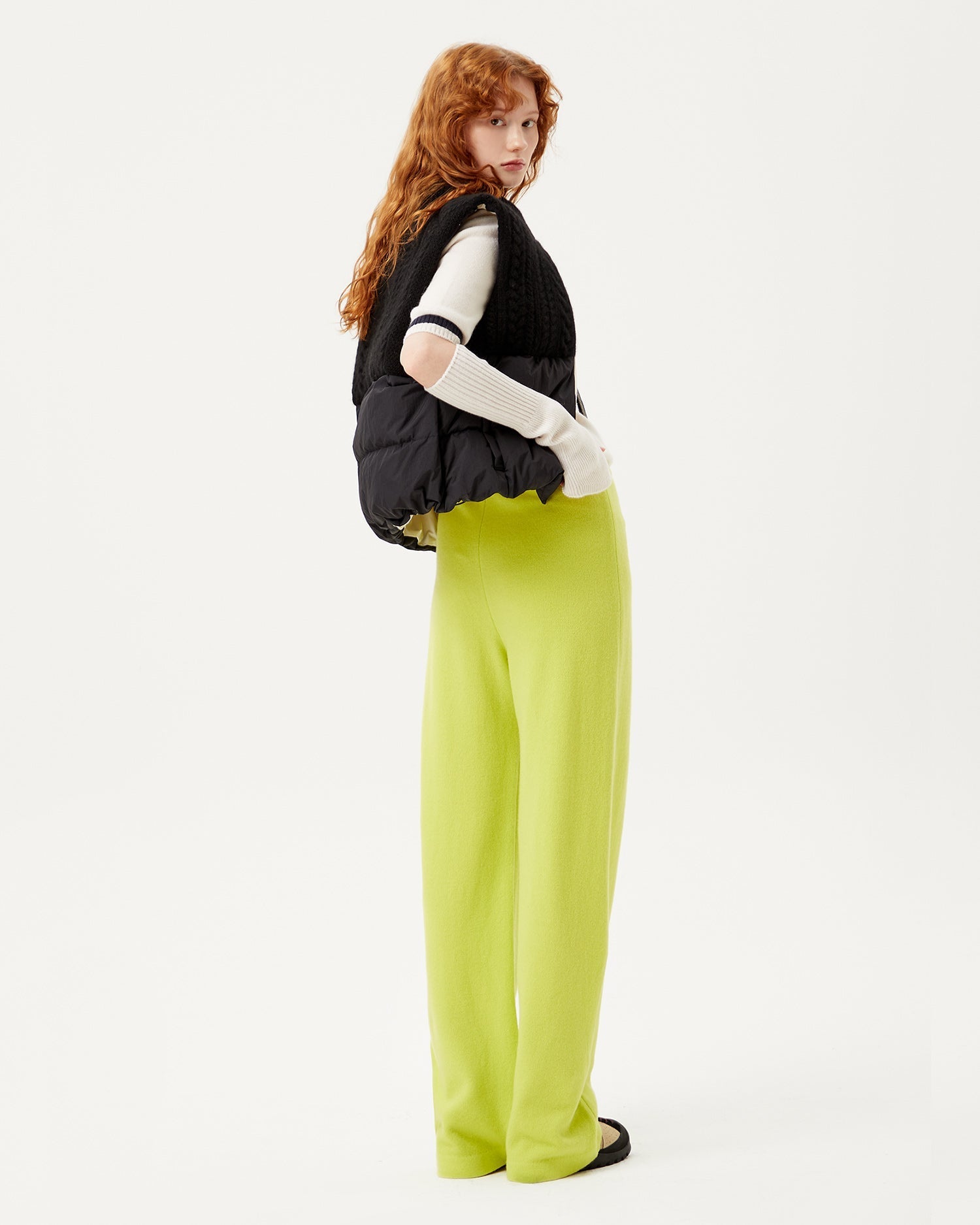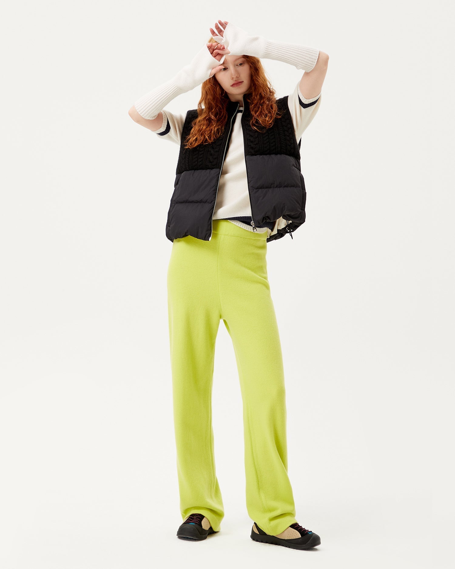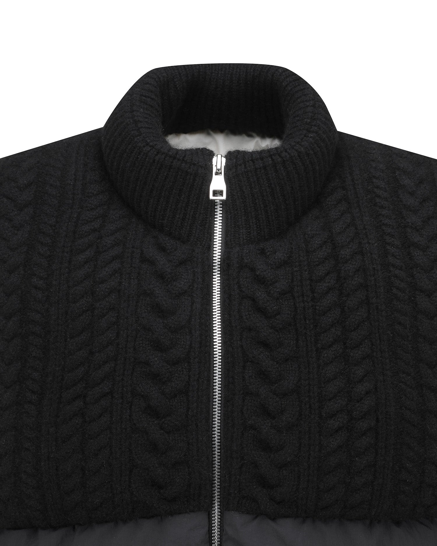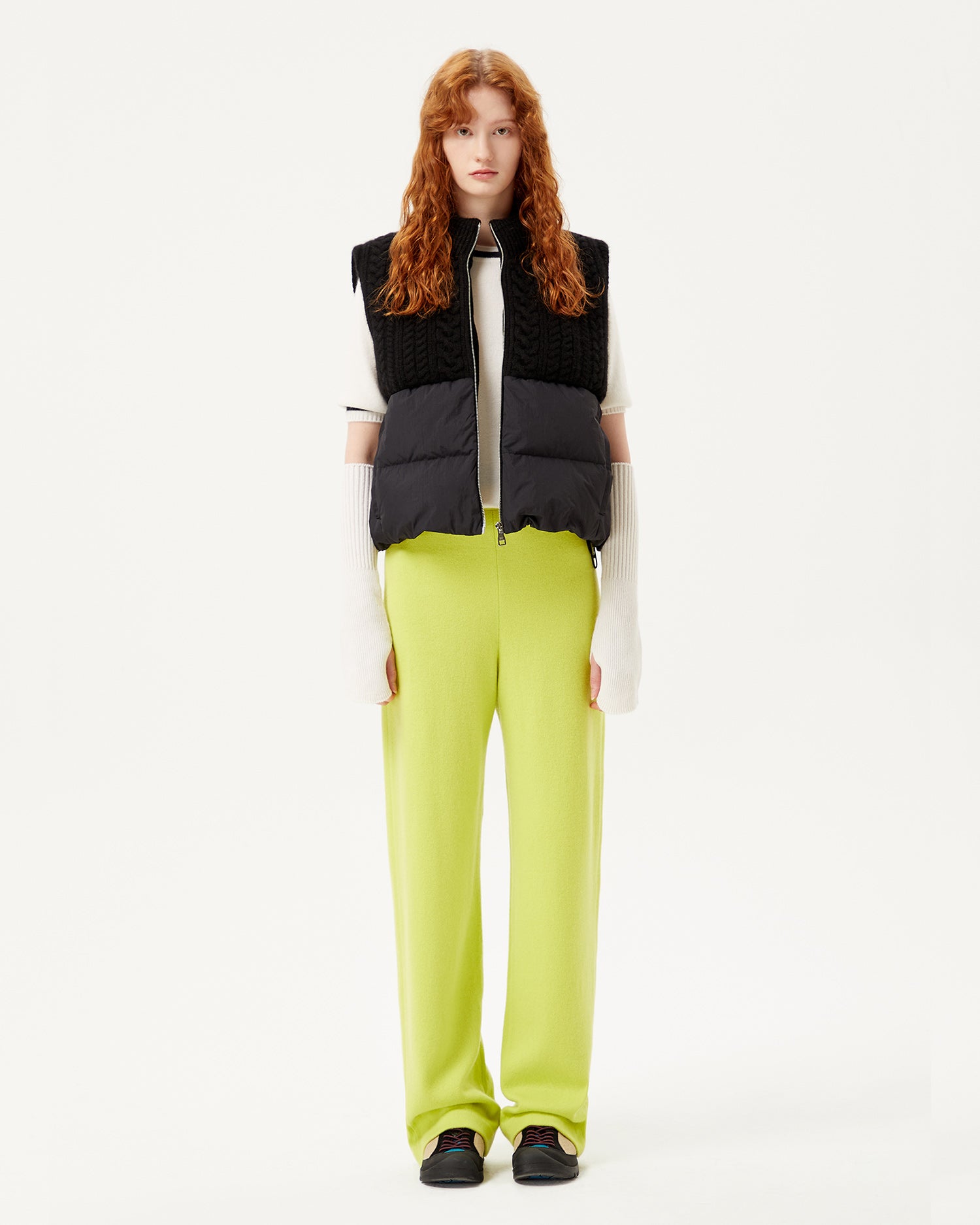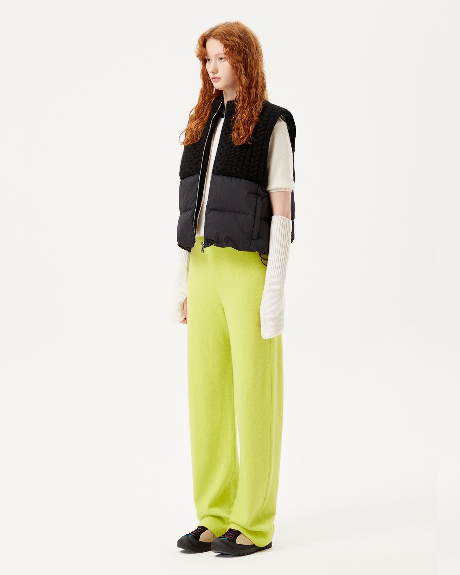 Puffer Vest with a luxurious cable-knit design. Experience lightweight and coziness, making it perfect for any occasions, complementing both casual and elegant looks. The adjustable bottom string allows you to effortlessly tailor the silhouette to your preference. Crafted from 100% sustainable cashmere and recycled goose down.
