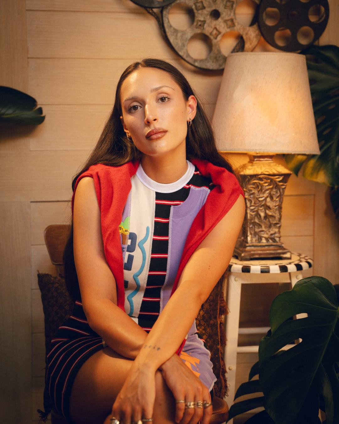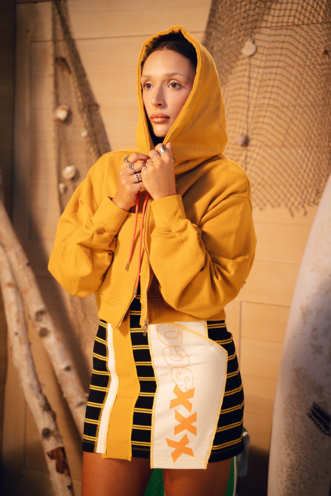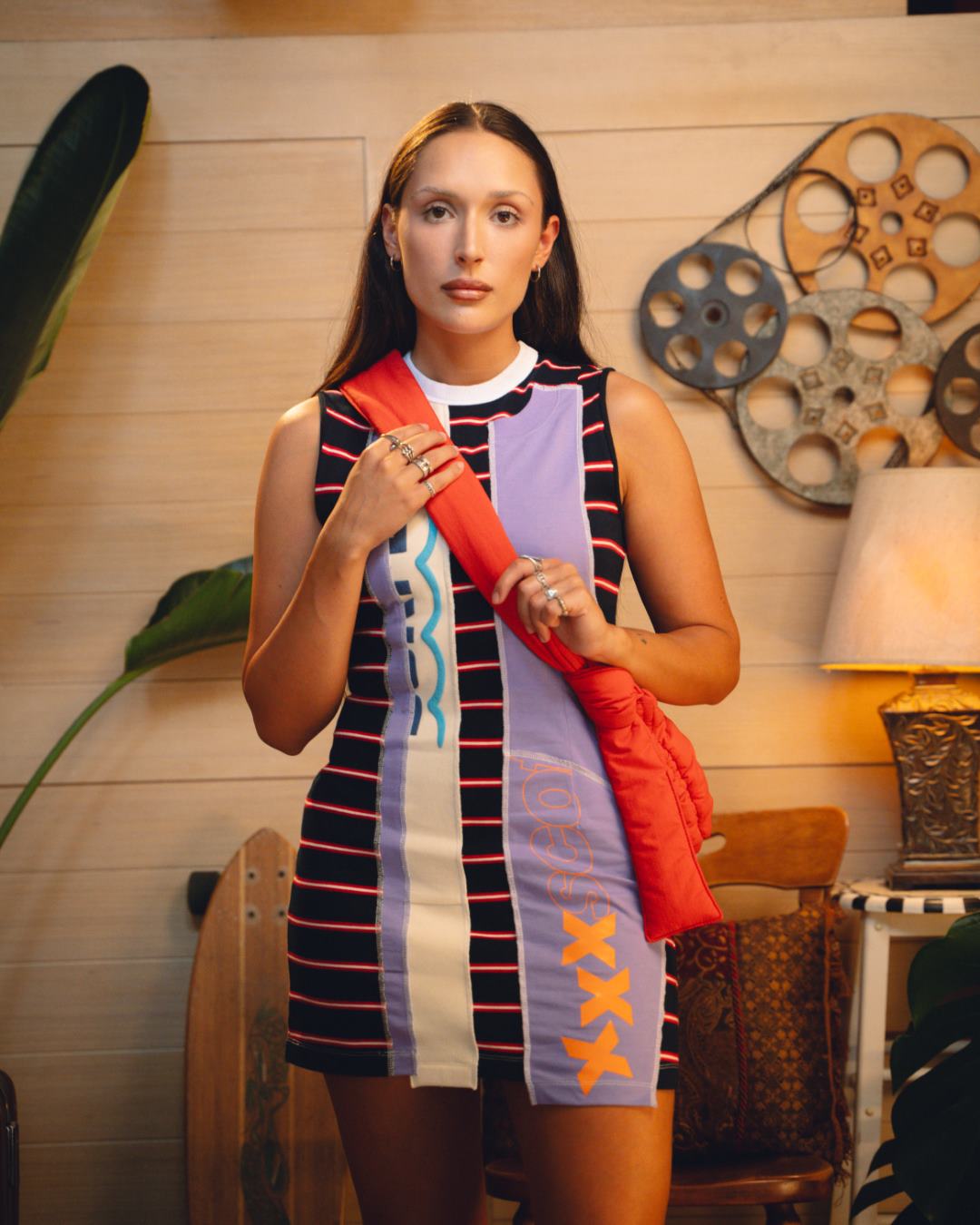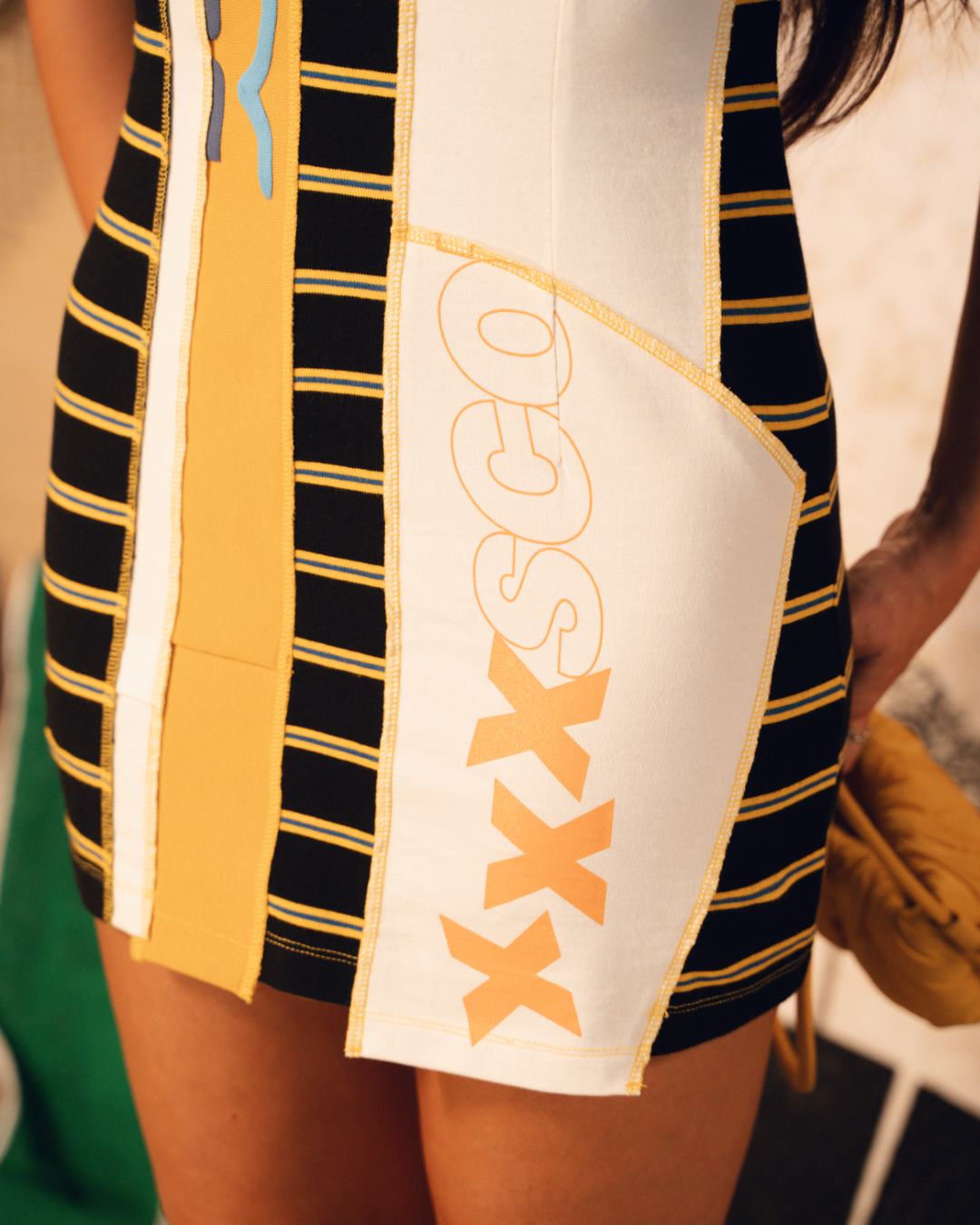 - A dress made from a combination of leftover sweatshirts, hoodie scraps, and striped fabrics