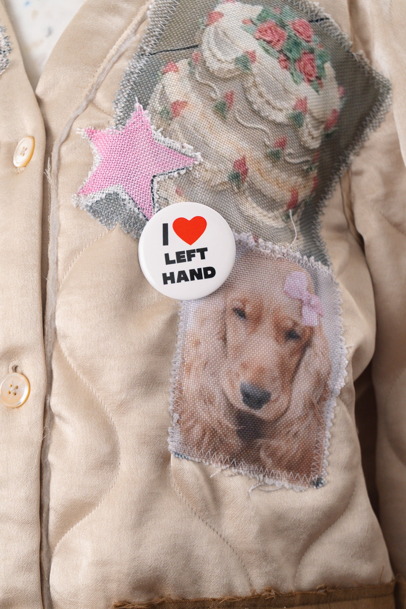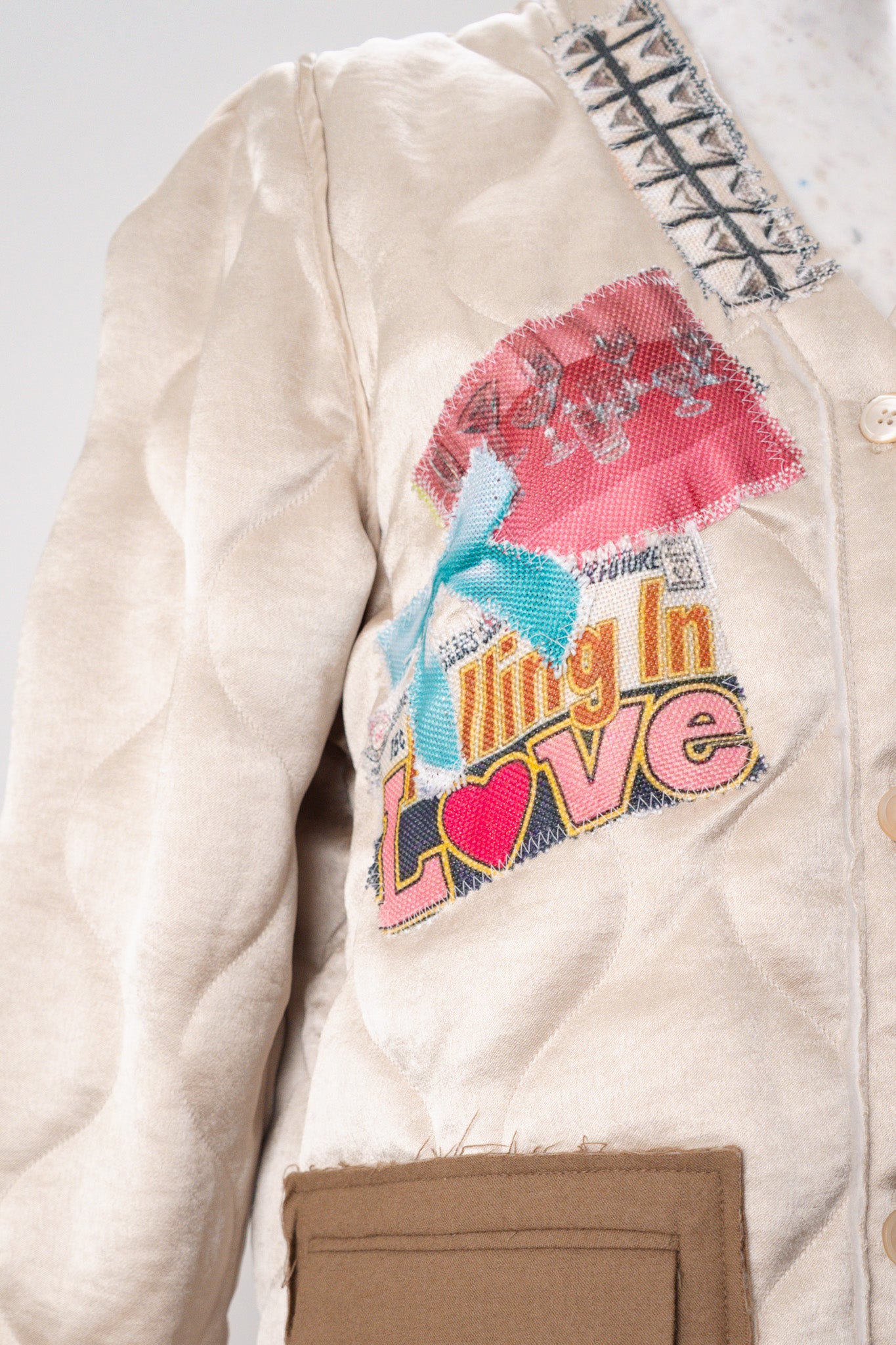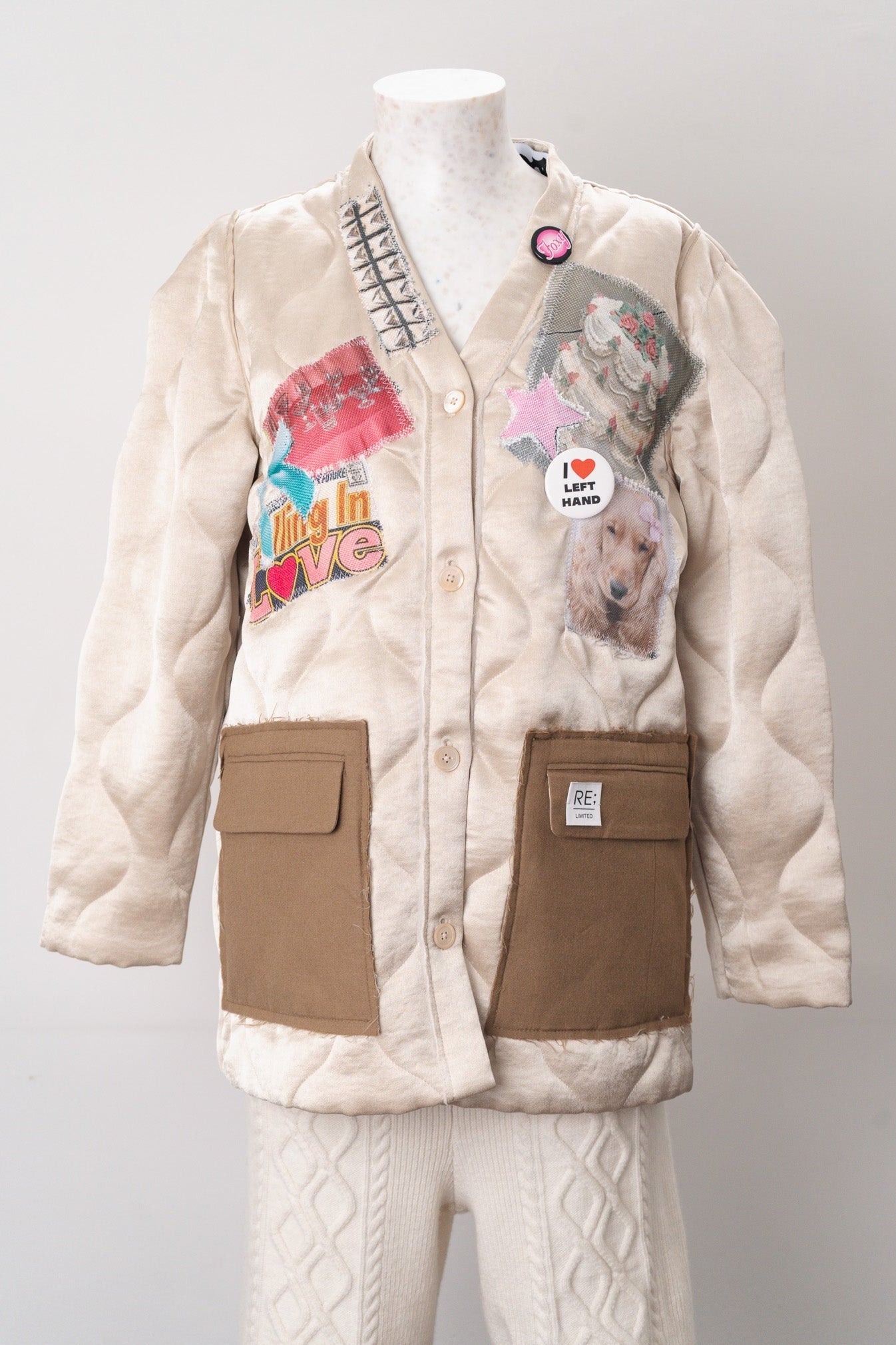 This design is a woven cardigan incorporating sustainable fabrics and padding. It features raw-cut details and voluminous sleeves as an emphasis. Upcycled into a one-of-one piece with patches designed and hand-sewn by Left Hand LA.