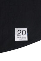 To minimize waste, the asymmetrical patchwork design was applied, and a reversed label detail was added to the back. Logo-engraved nut buttons and a single chest pocket add practical touches to the overall look.