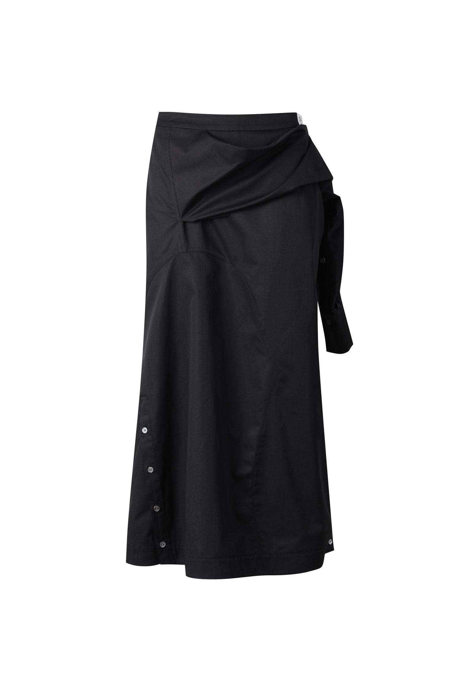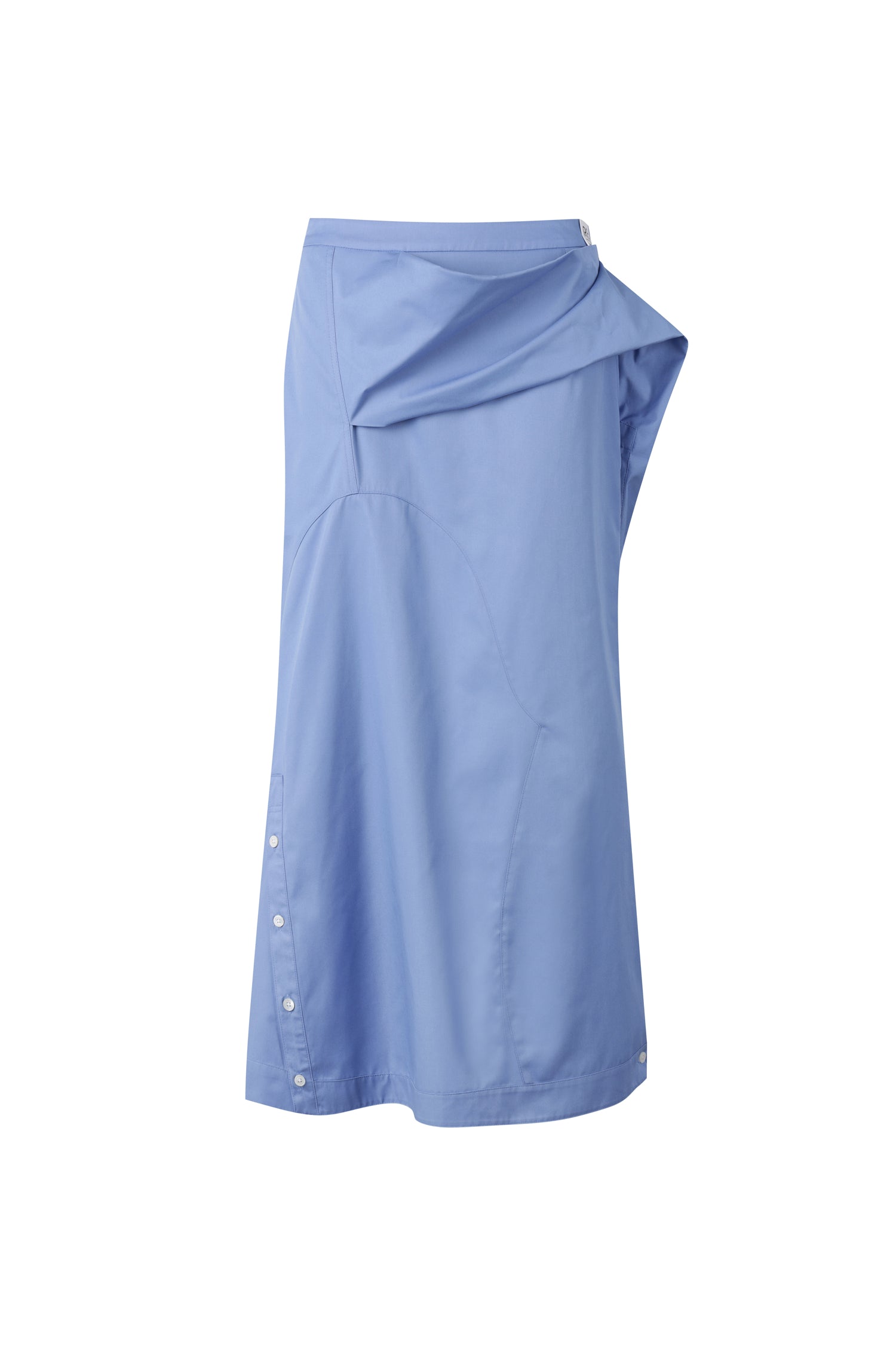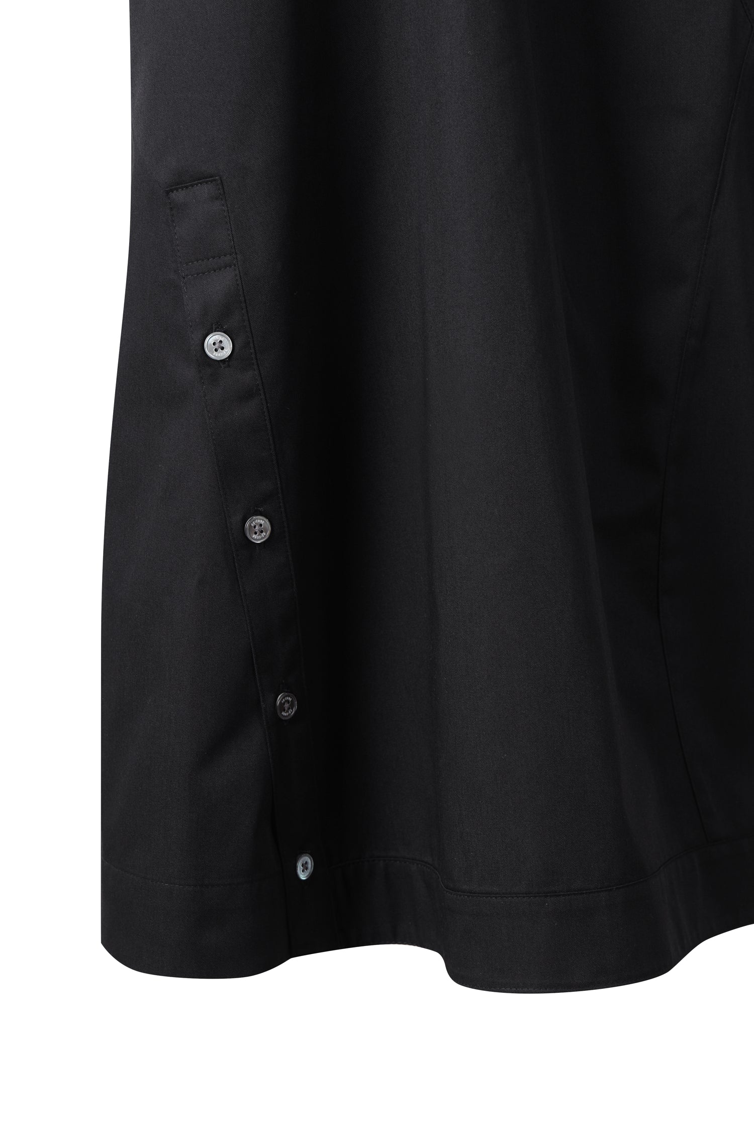An H-line skirt with a harmonious combination of buttons on the side and draping sleeves that turn out from the front ,and the structural form of the sleeve pattern spreading out from the hem represents an architectural element. - The fabric is woven with high-density 60-count organic cotton and a special washer is used for the finishing to create a natural and luxurious touch.