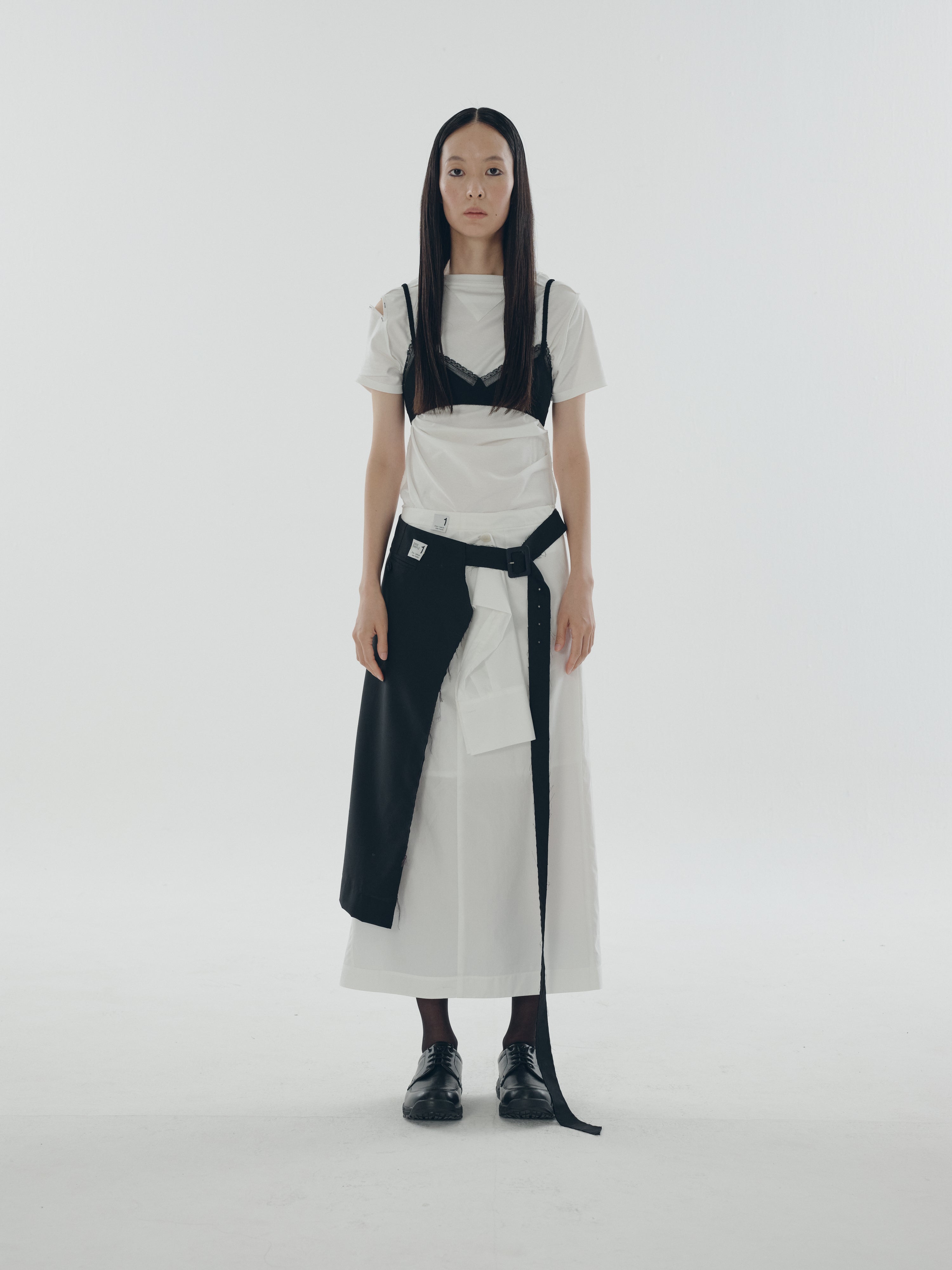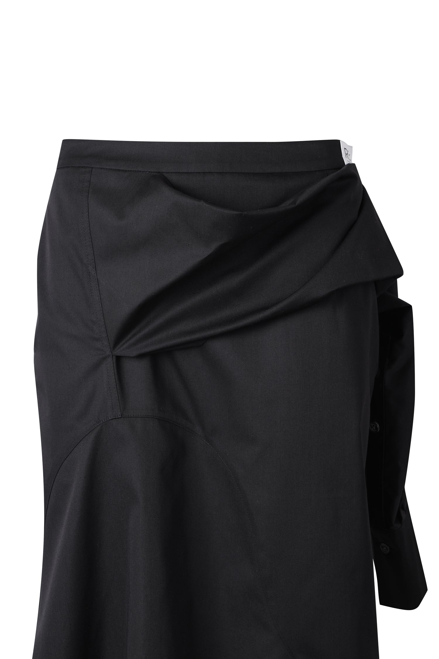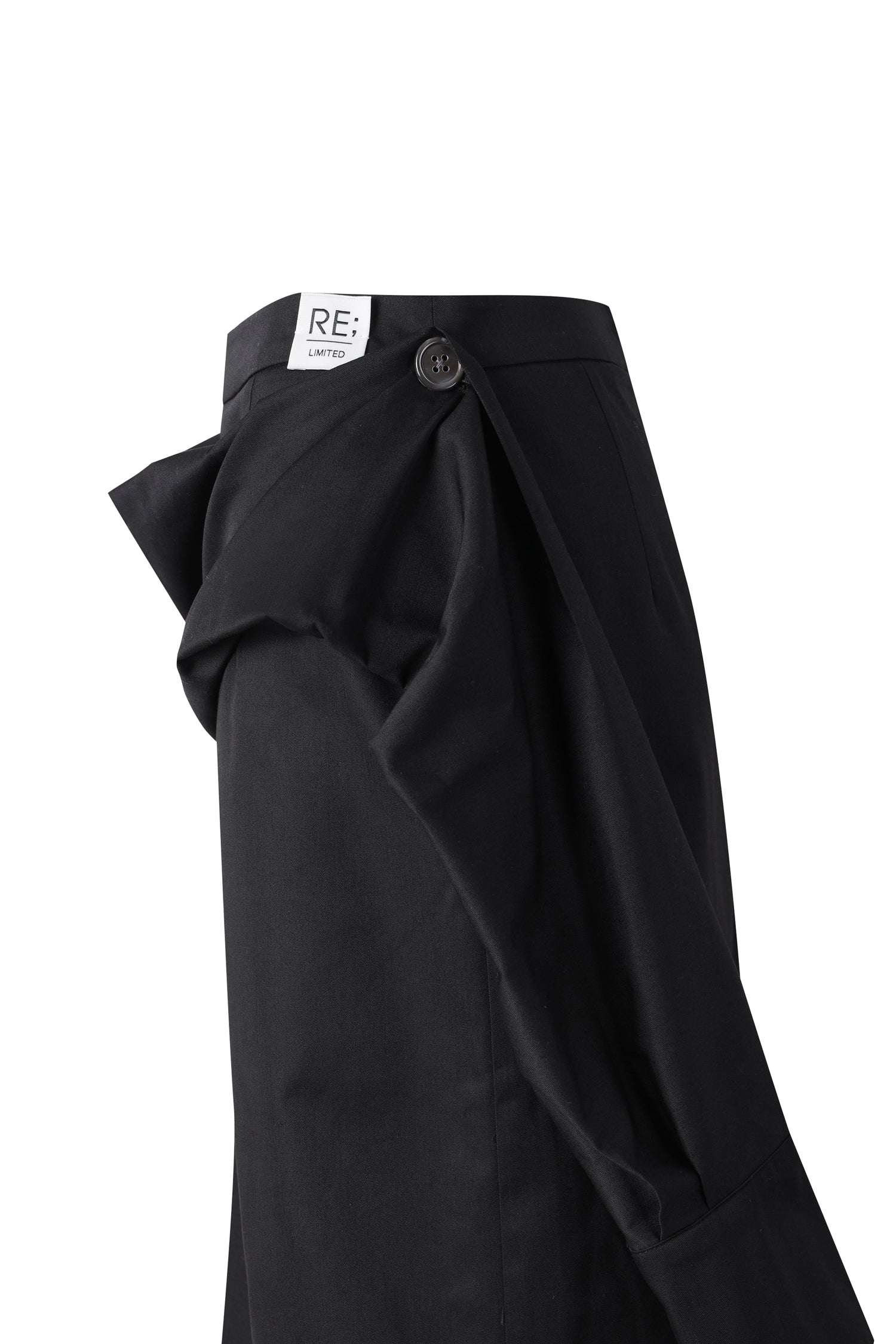 An H-line skirt with a harmonious combination of buttons on the side and draping sleeves that turn out from the front ,and the structural form of the sleeve pattern spreading out from the hem represents an architectural element. - The fabric is woven with high-density 60-count organic cotton and a special washer is used for the finishing to create a natural and luxurious touch.