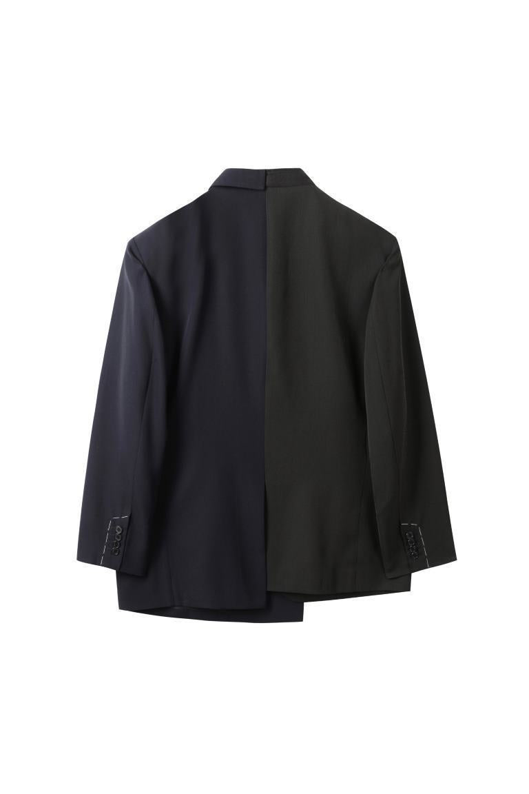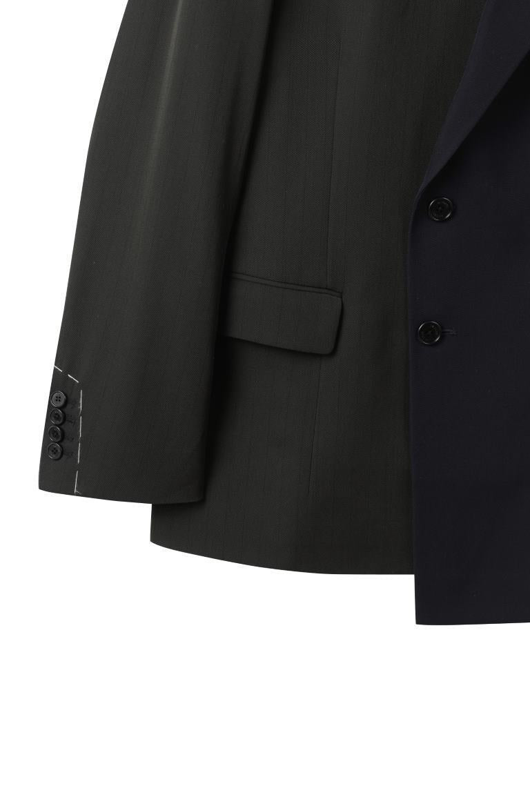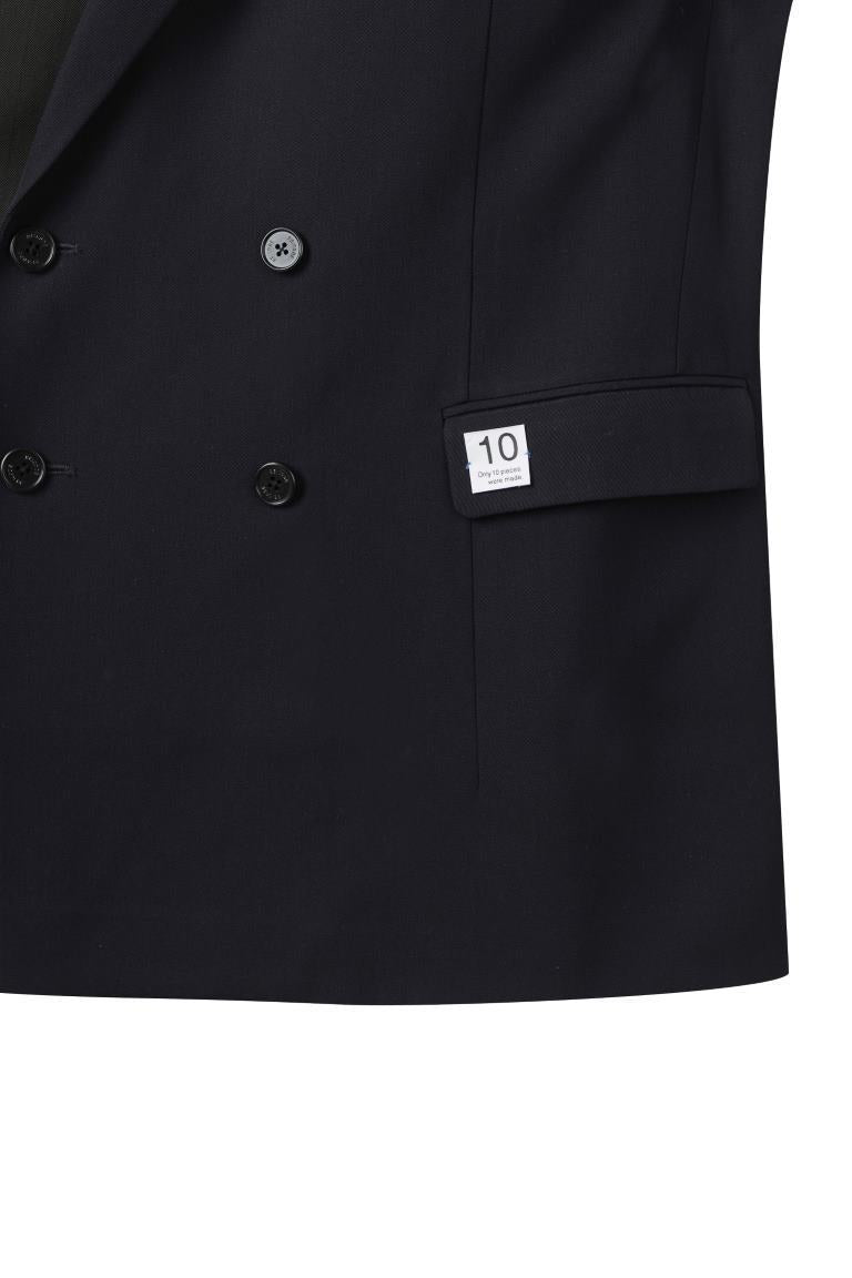 Two jackets, one single and one double, were intricately combined, and were made with 'clear twill' deadstock fabric mixed with viscose rayon. The combination of solid navy and striped khaki materials is impressive, and can be worn as a set-up with the Split Short Pants. The logo-engraved button is made from recycled milk protein.