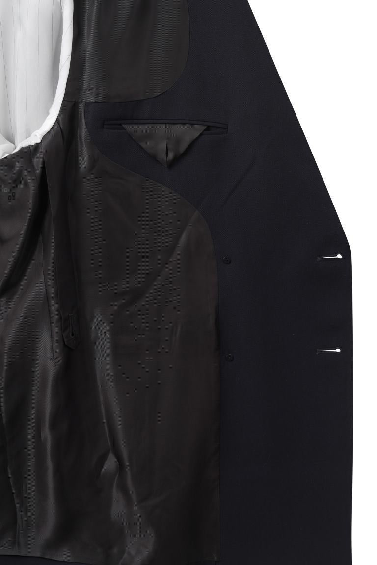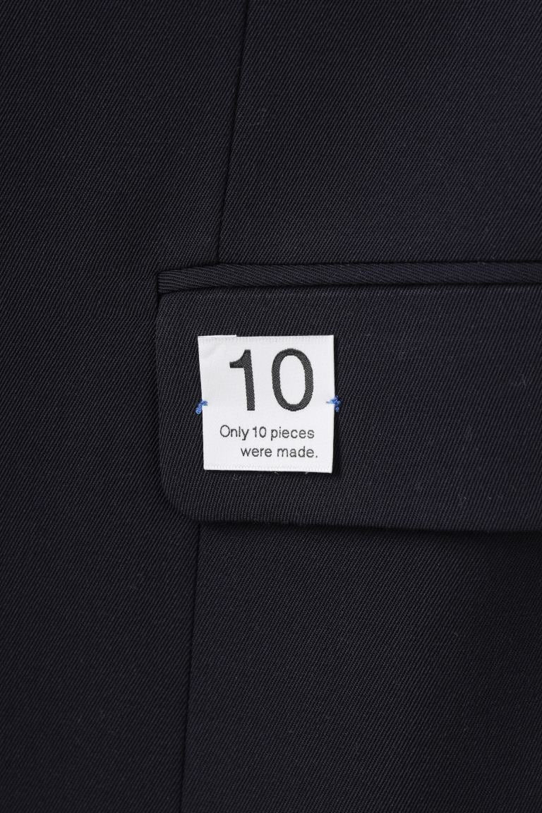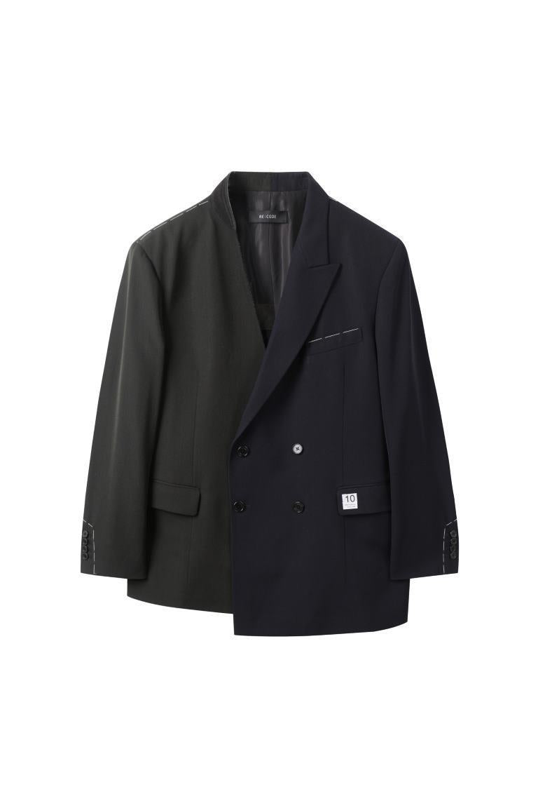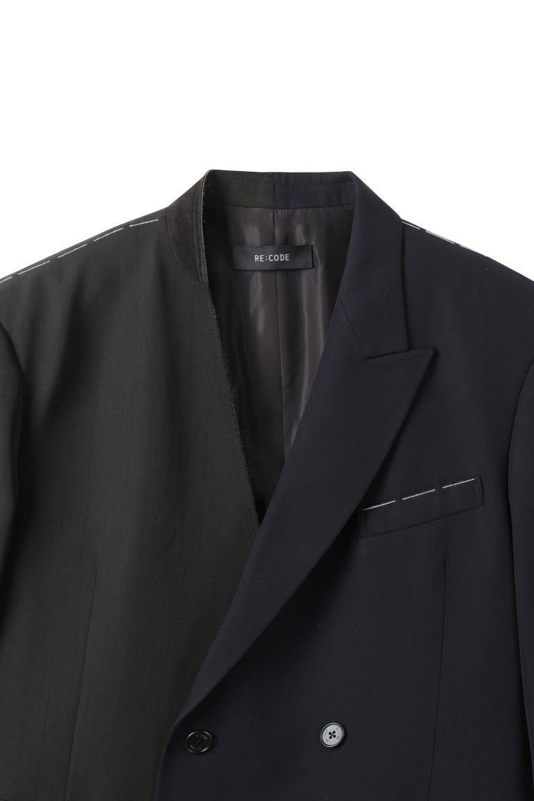 Two jackets, one single and one double, were intricately combined, and were made with 'clear twill' deadstock fabric mixed with viscose rayon. The combination of solid navy and striped khaki materials is impressive, and can be worn as a set-up with the Split Short Pants. The logo-engraved button is made from recycled milk protein.