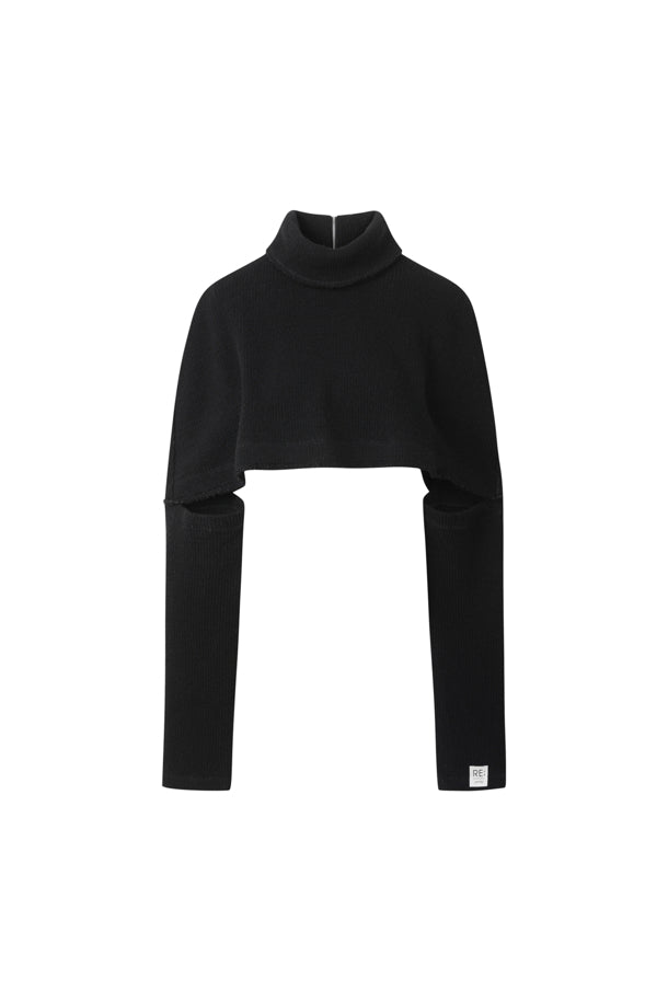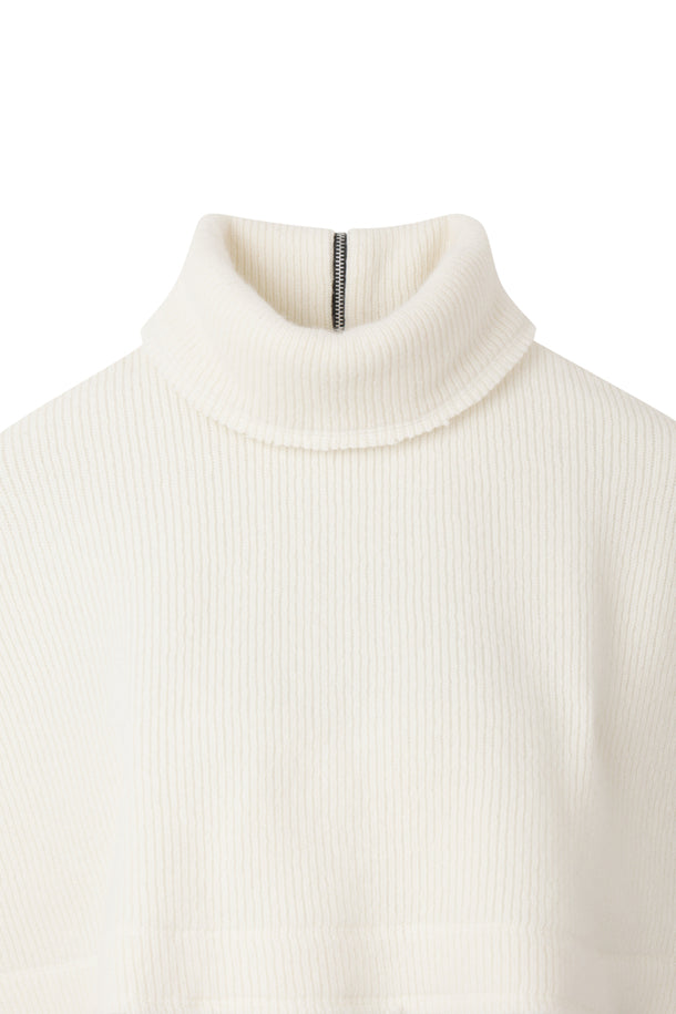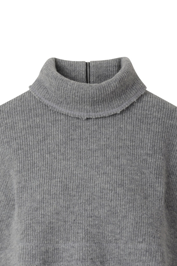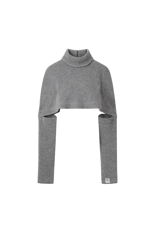 A cape-style shawl knit that can be styled front to back according to the wearer's preference.