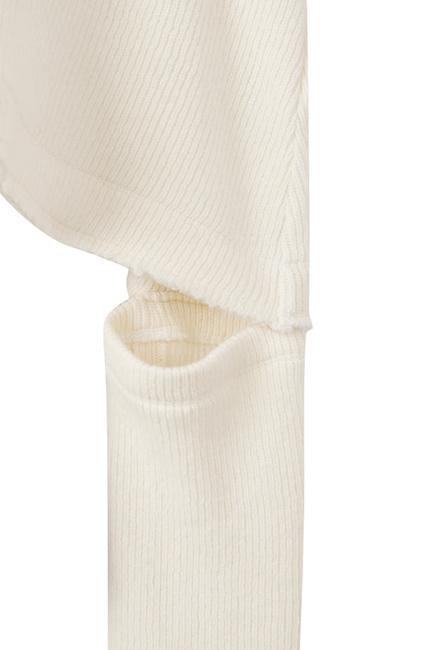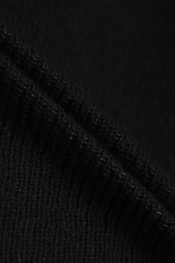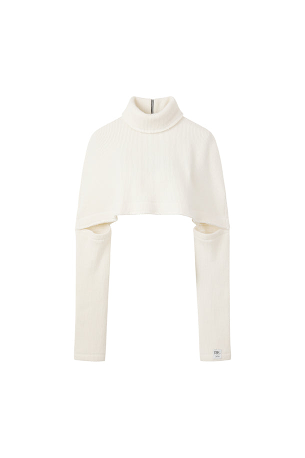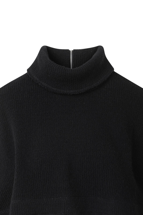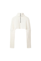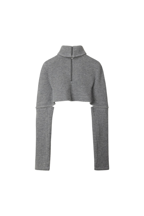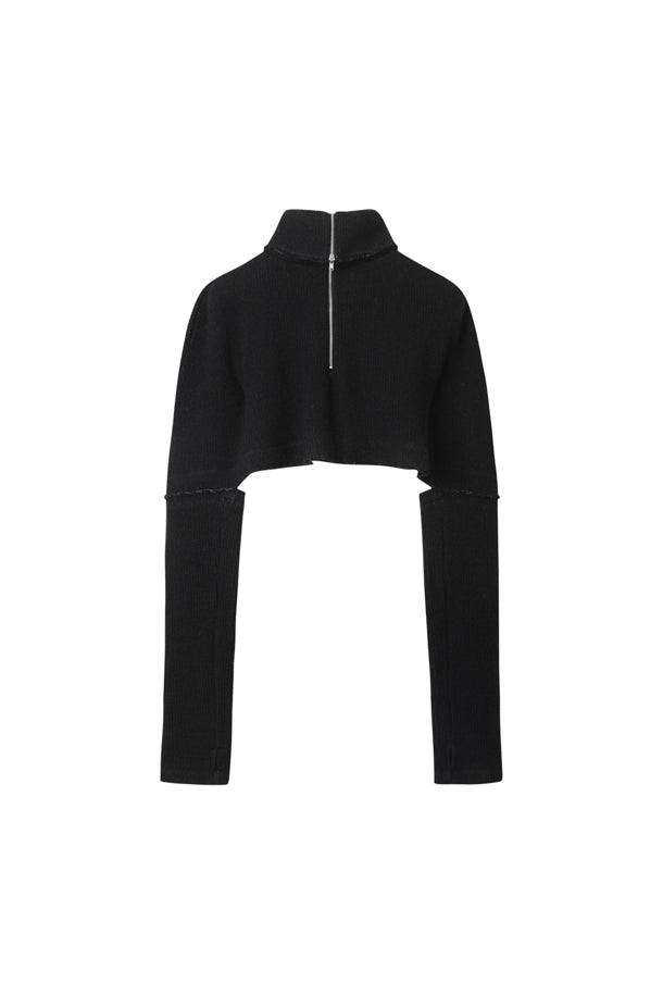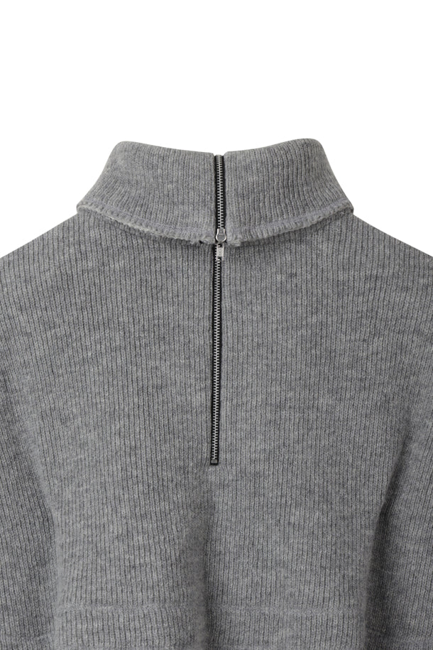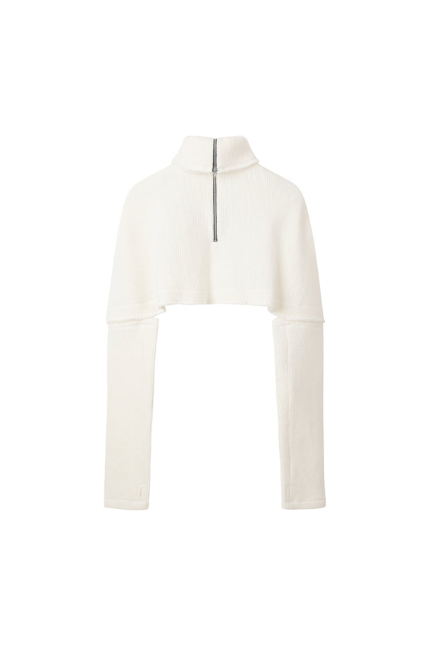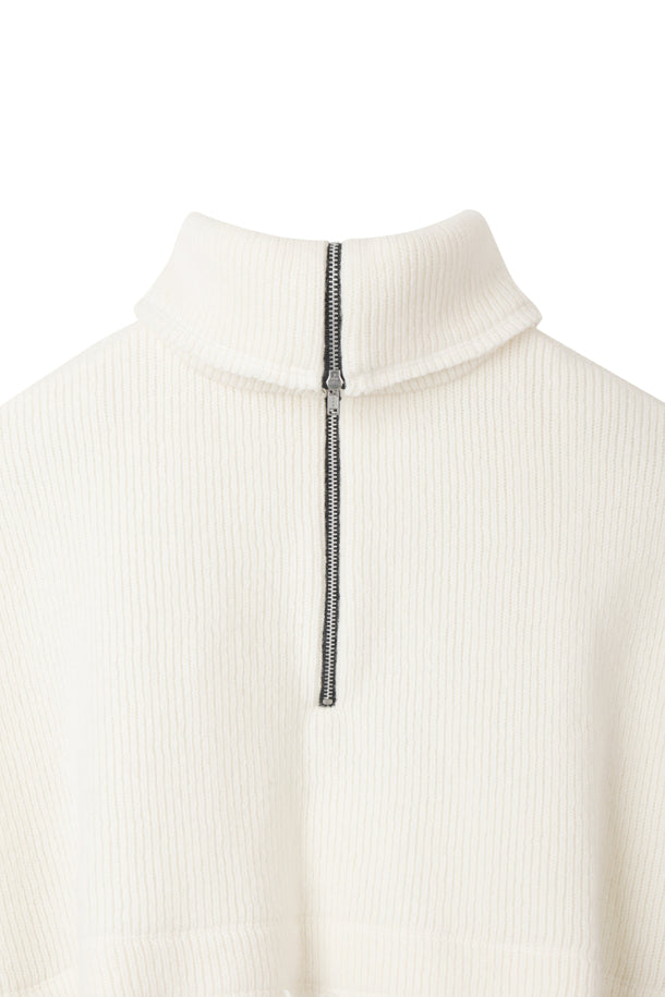 the outer surface is made of low-gauge fabric for a structured texture. The YKK half-zip zipper and raw edge details complete the unique look.