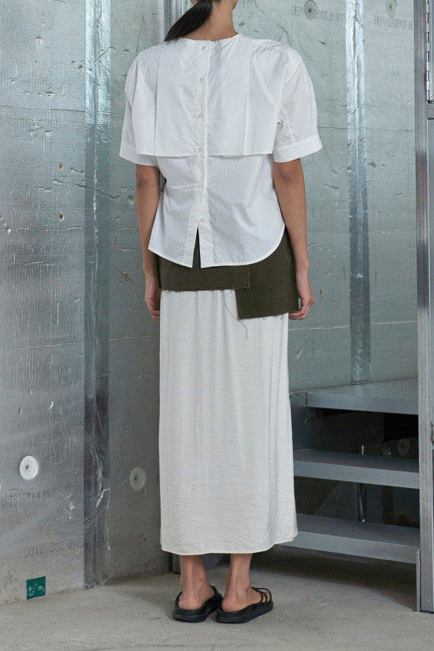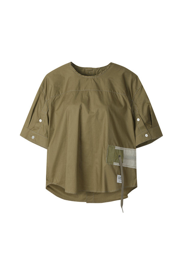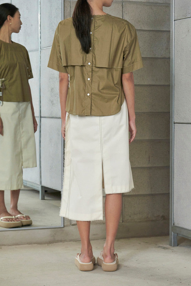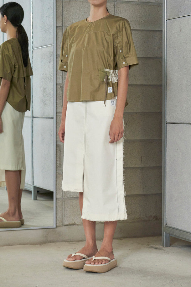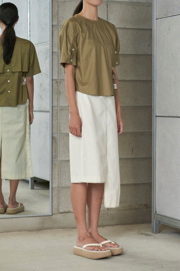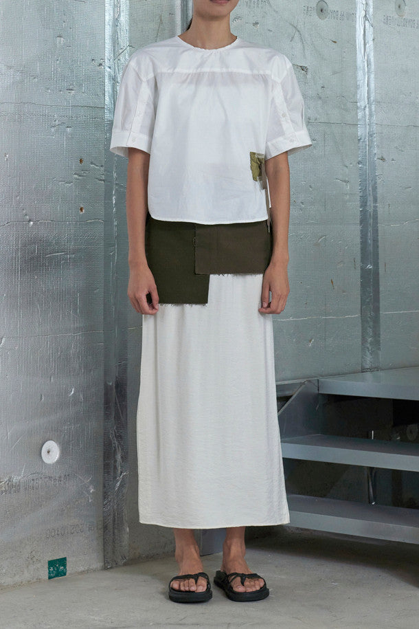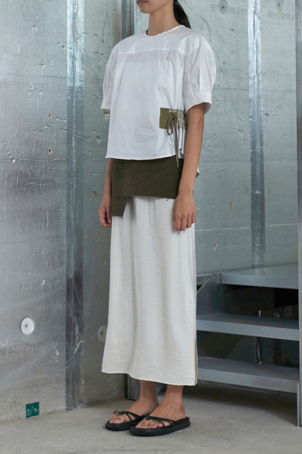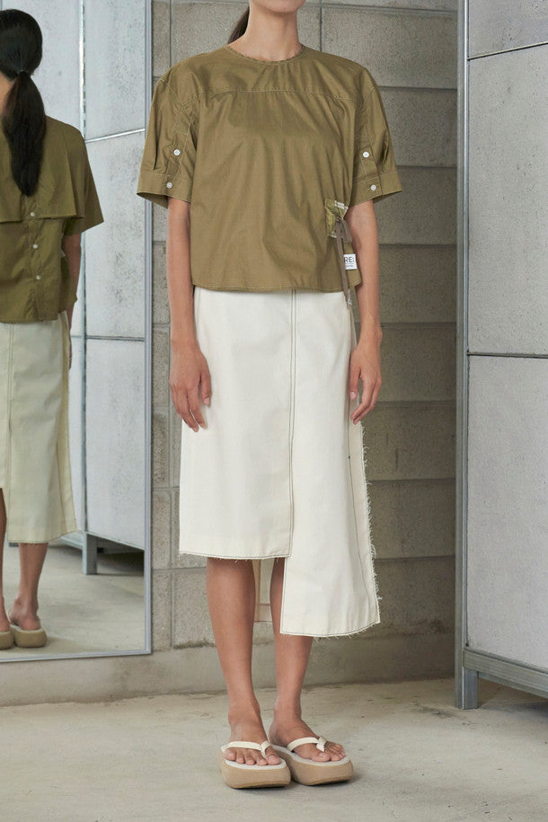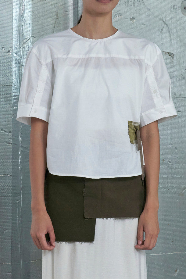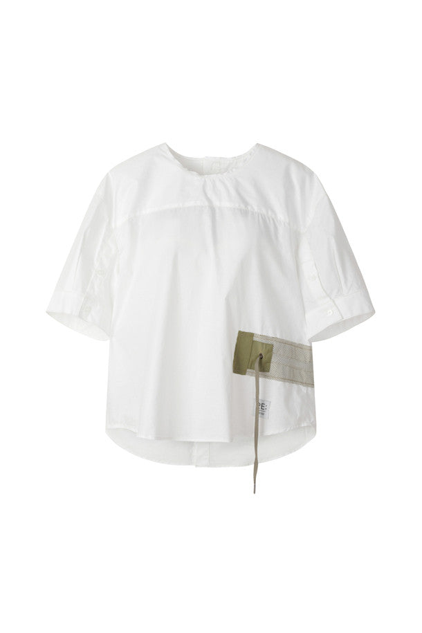 This product incorporates leftover fabric patches from production into the waist detail, creating a unique accent. It's a blouse crafted from organic cotton fabric."